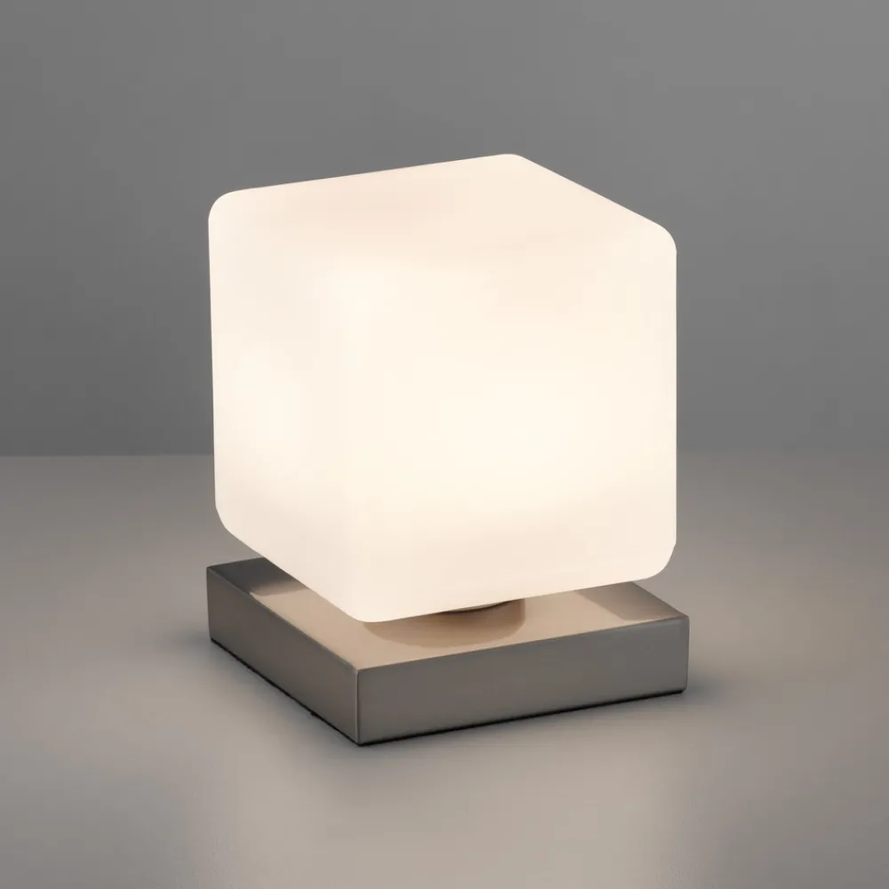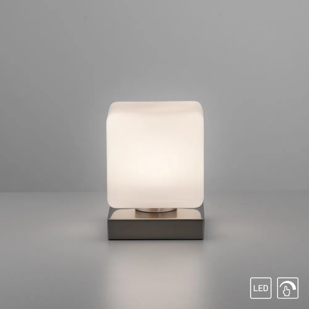 Dadoa LED-bordlampe i glass med berøringsdimmer Dadoa LED-bordlampe har en diskret, tidløs design. Lampeskjermen ser ut som en kube, montert på en firkantet lampefot. Lampens varmhvite lys skaper en hyggelig atmosfære i rommet. Den integrerte berøringsdimmeren gjør det mulig å dimme bordlampen i tre nivåer (10 %-50 %-100 %). Takket være det diskrete utseendet kan lampen integreres i alle typer innredningsstiler.