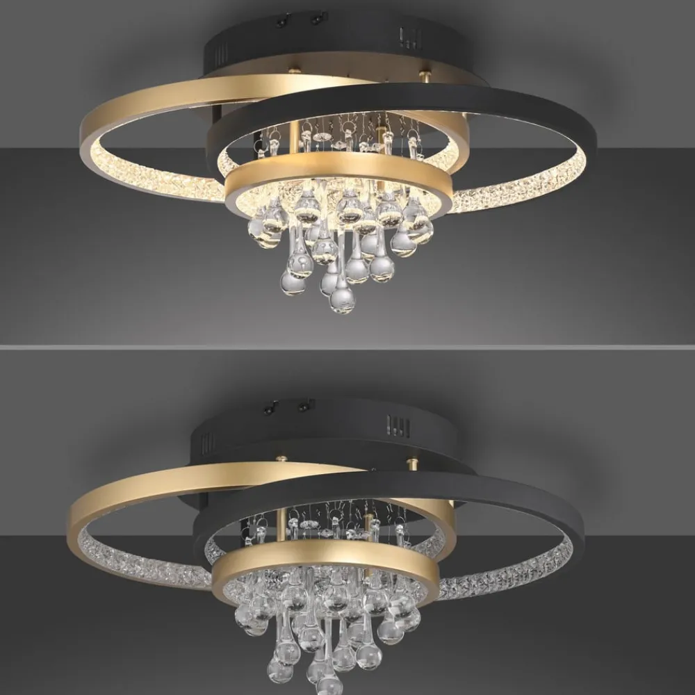 Dimbar LED-taklampe Rotazo med krystallpendler og regulerbar lysfarge (CCT) LED-taklampen Rotazo imponerer med en fargekombinasjon av svart og messing. Det varmhvite LED-lyset reflekteres behagelig gjennom lysringene. De gjennomsiktige krystallene i midten gir armaturen en spesiell sjarm og skaper et vakkert lysspill. Takket være Switchmo-teknologien kan lyset justeres i tre ulike dimmenivåer ved hjelp av den vanlige lysbryteren og dermed tilpasses personlige behov. Den innbydende atmosfæren som armaturen utstråler, gjør den spesielt egnet for stue, spisestue og soverom.