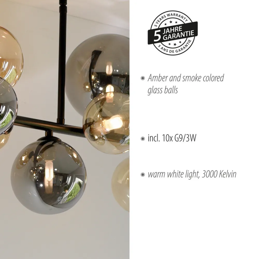 G9-pære kan skiftes ut: Popsicle taklampe med tonede lampeskjermer i glass Den vakkert designede, svarte Popsicle taklampen med lampeskjermer i ravfarget og røykgrått glass i ulike størrelser vil gi stuen din en dekorativ glød. Den leveres med ti varmhvite G9 LED-pærer, som avgir et vakkert lysspill gjennom lampeskjermene av glass. Plassert over et spisebord skaper Popsicle en koselig og hjemmekoselig atmosfære.
