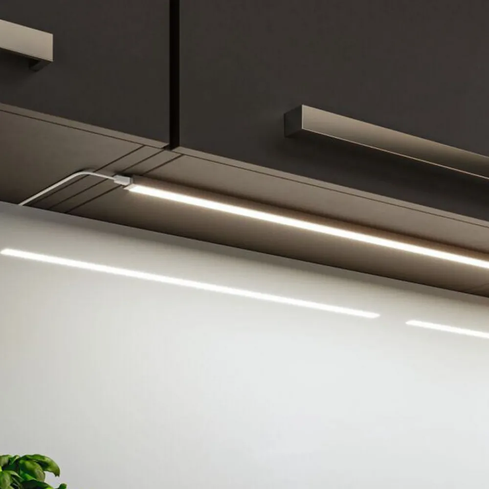 Moderne kjøkkenbelysning med bevegelsesstyring og justerbar lysfarge – LED underskapslampe Inline, startsett med to lamper LED underskapslampen Inline er designet for funksjonell belysning av arbeidsflater på kjøkkenet. Den består av en slank aluminiumsprofil og skjerm med rengjøringsvennlige overflater. En integrert PIR-sensor sørger for berøringsfri betjening – praktisk og hygienisk. Lysfargen kan justeres fra varmhvit til dagslys ved å tørke av sensoren med hånden – Startsett med to lamper, tilkoblingsledning med pluggbar strømforsyningsenhet, tilkoblingsledning, installasjonsmateriell – Kan suppleres med et utvidelsessett (opp til en maksimal total effekt på 24 W) – PIR-sensoren på den første lampen brukes til å styre alle andre tilkoblede lamper sammen – Minnefunksjon som lagrer valgt lysfarge