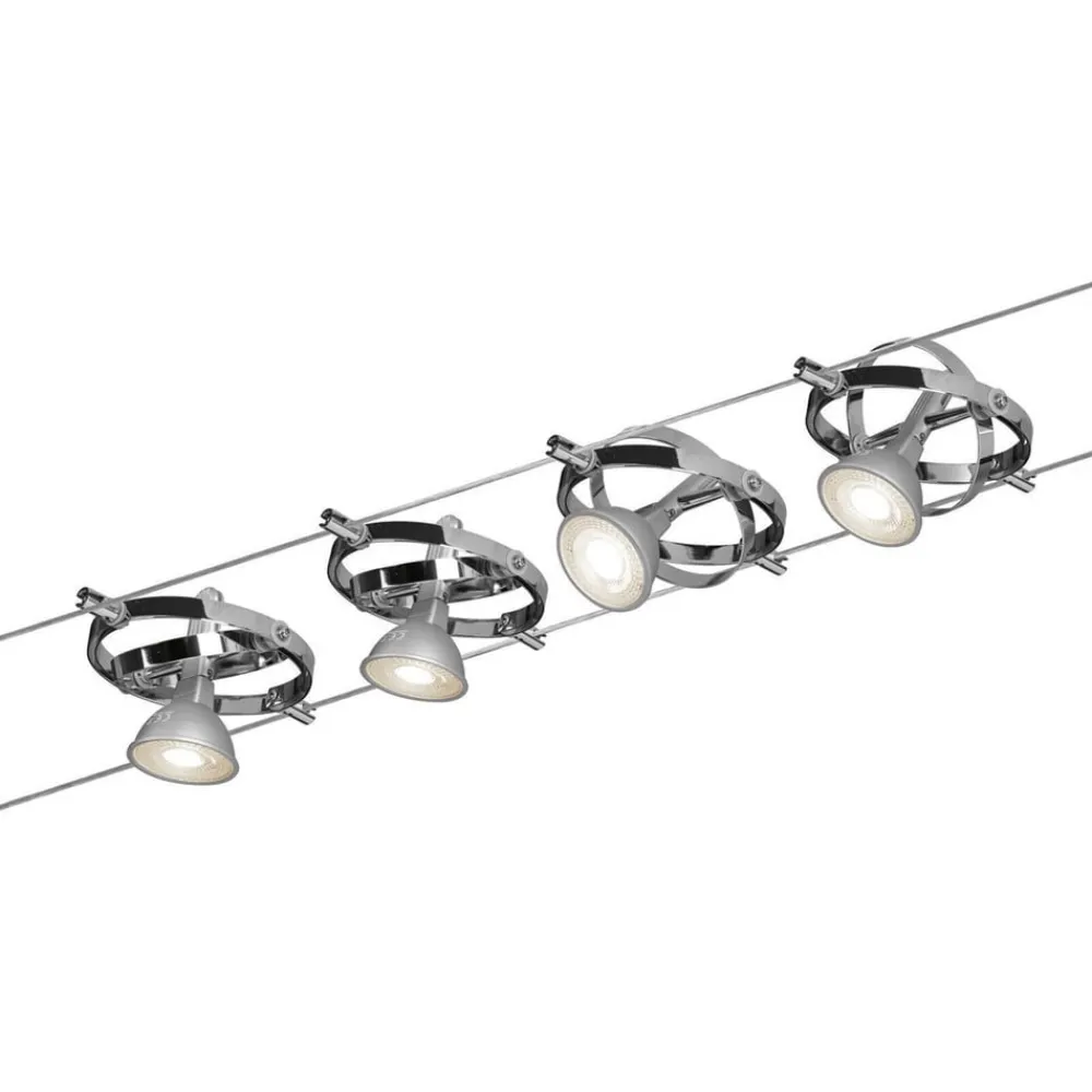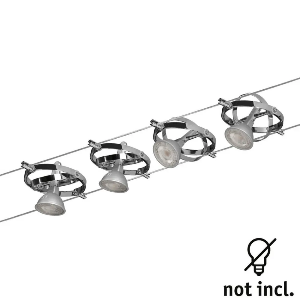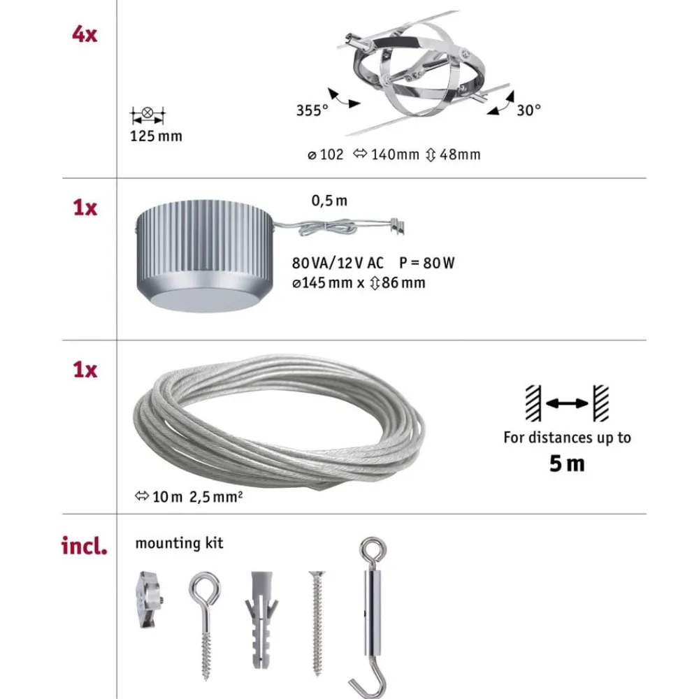 Fire vaiersystem Cardan leveres klar for tilkobling med transformator, kabel og fire lys. Pærene i de fire soklene er hver omgitt av to smale metallringer, hvorved den horisontale ringen kan svinges 30° og den vertikale ringen 355°. Monteringsmaterialet, som vaiersystem med både i tak og på vegg, er inkludert i leveringsomfanget, lamper (GU 5,3 maks. 10 W) er ikke inkludert.