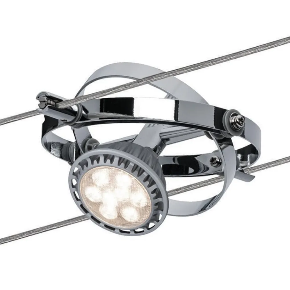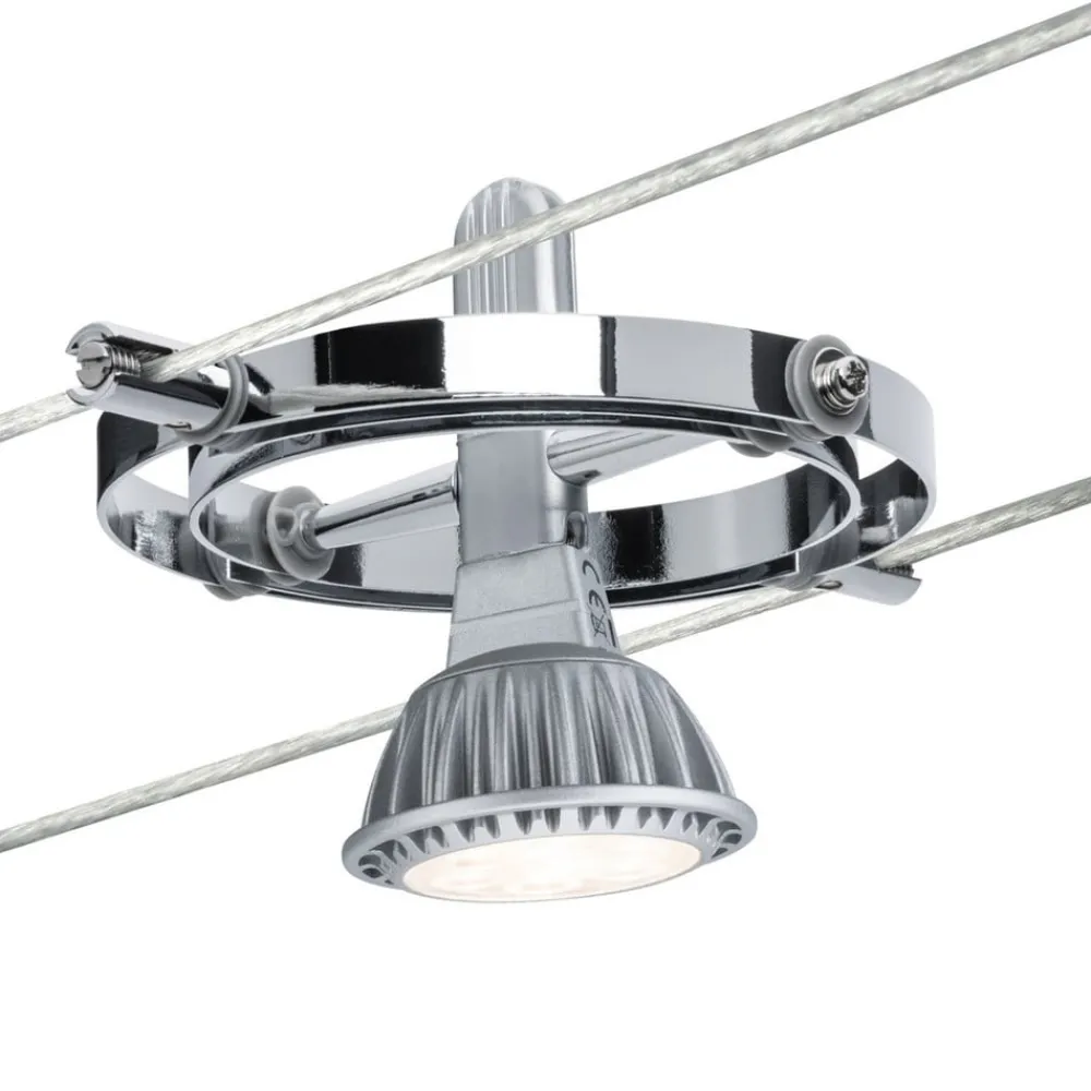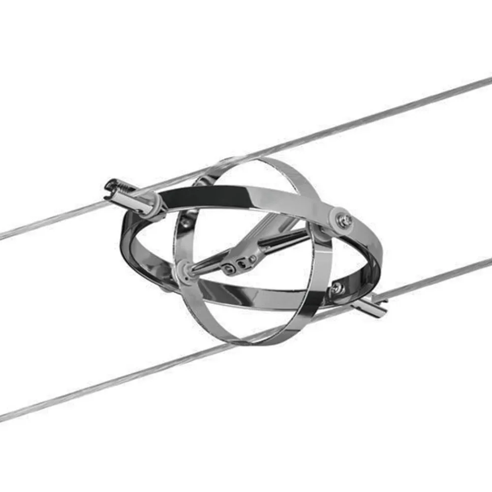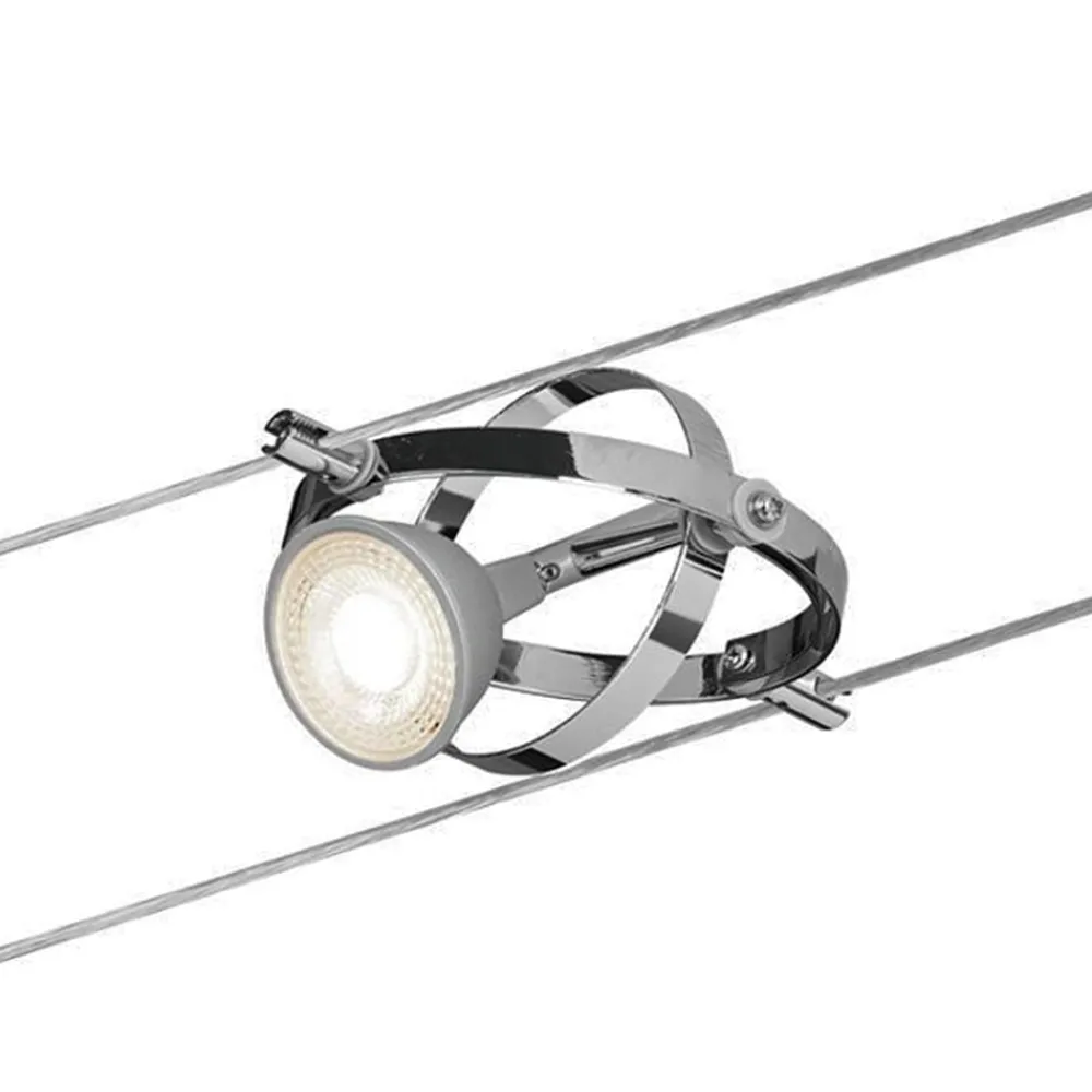 Fire vaiersystem Cardan leveres klar for tilkobling med transformator, kabel og fire lys. Pærene i de fire soklene er hver omgitt av to smale metallringer, hvorved den horisontale ringen kan svinges 30° og den vertikale ringen 355°. Monteringsmaterialet, som vaiersystem med både i tak og på vegg, er inkludert i leveringsomfanget, lamper (GU 5,3 maks. 10 W) er ikke inkludert.
