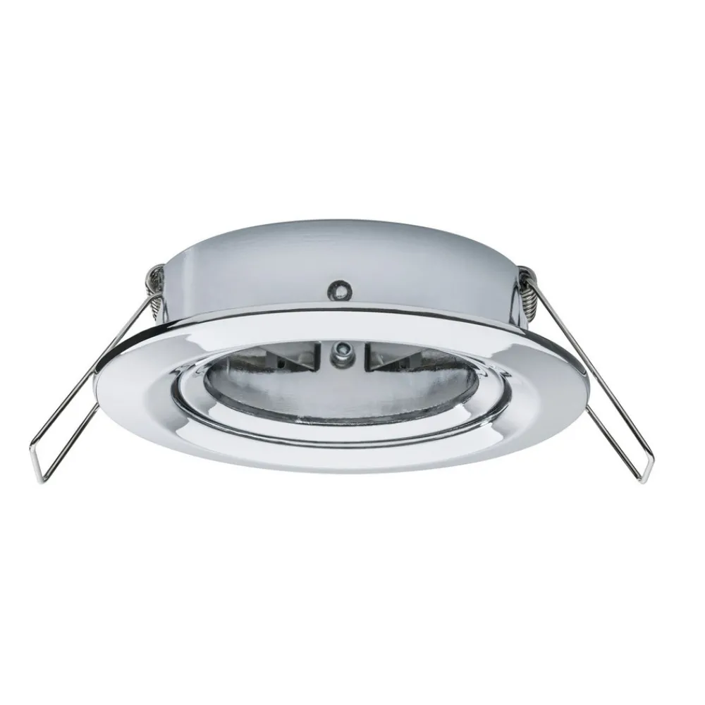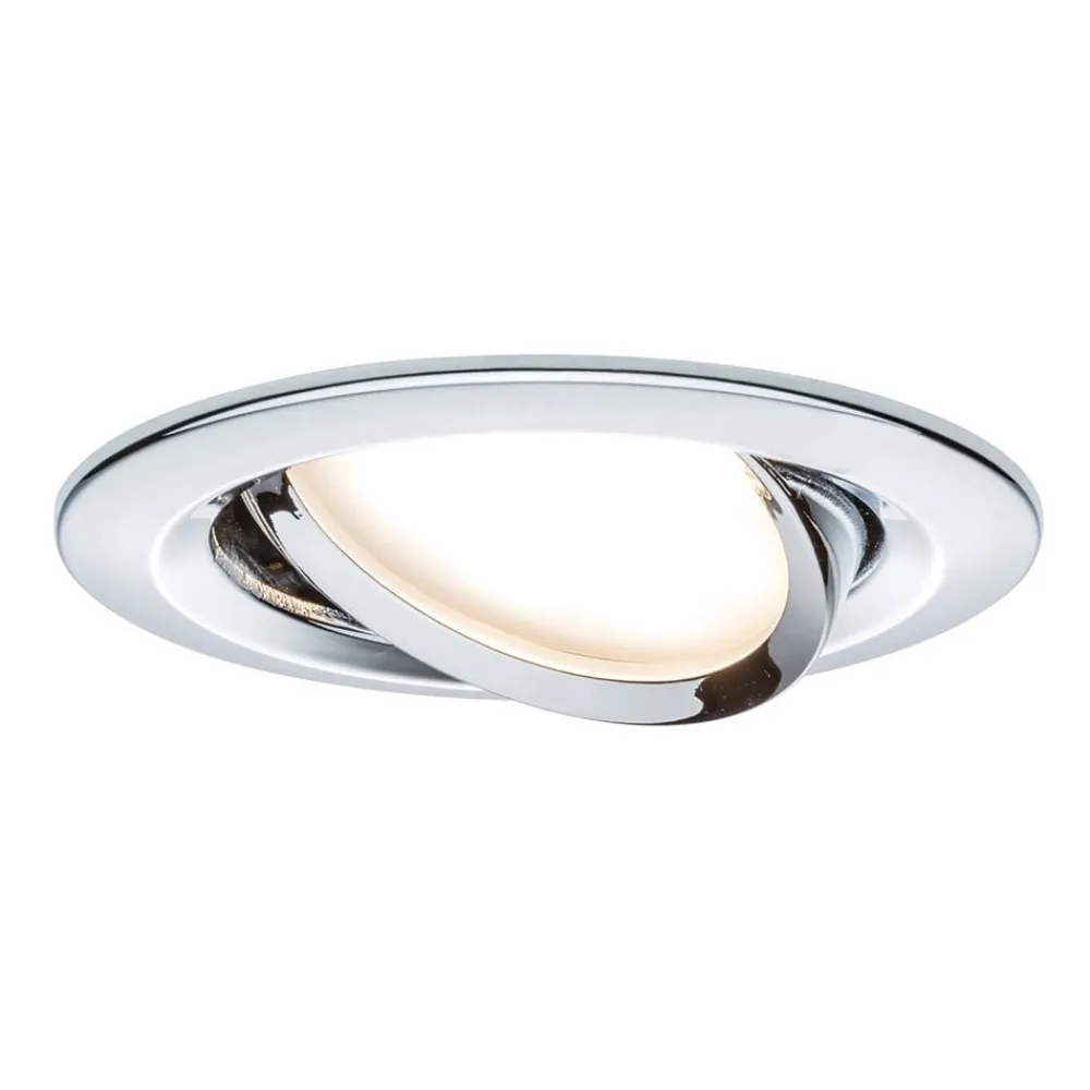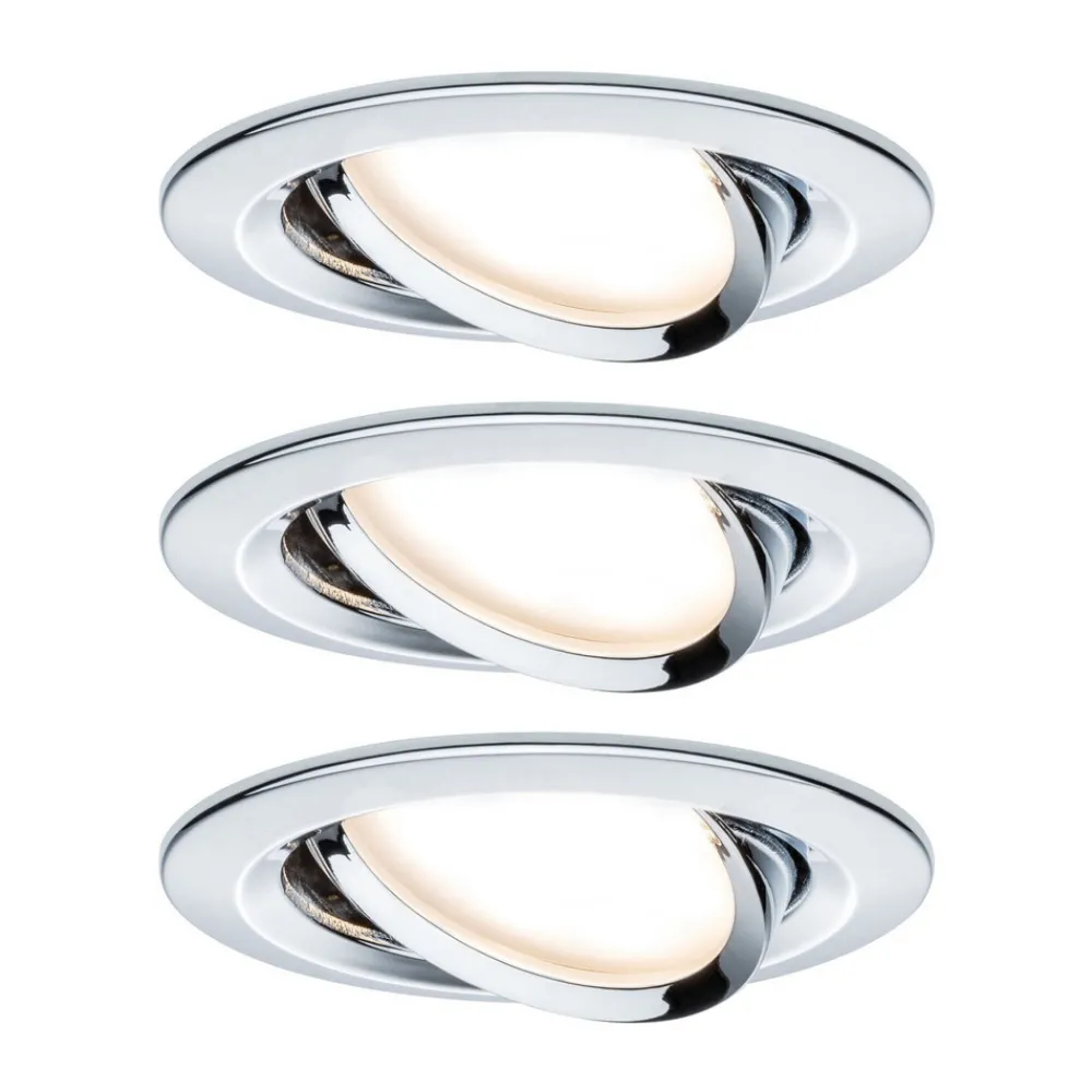 Den kromfargede LED-downlight leveres i et praktisk sett med 3 og imponerer med sitt enkle, moderne utseende. Et varmhvitt, blendfritt lys sendes ut gjennom det frostede beskyttelsesglasset, som er omgitt av en skinnende aluminiumsramme. Lysstrålen kan justeres optimalt ved å svinge mynten 50 ° og dermed belyse bestemte gjenstander eller områder på en målrettet måte.