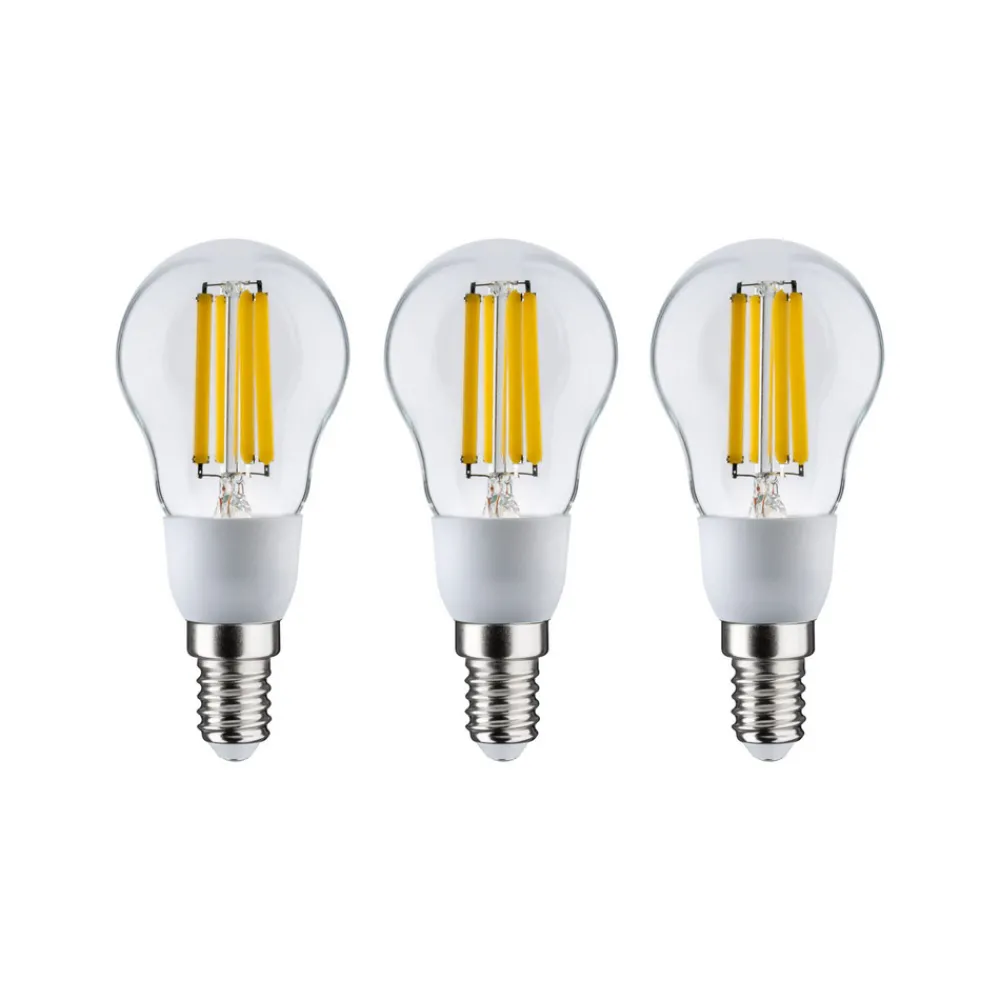 I en pakke med 3 stk. – LED-dråpelampe med E14-sokkel, varmhvit, glødetråd, 2,5 watt De ultraeffektive lyskildene i Eco-Line fra Paulmann kombinerer innovasjon med bærekraft. Takket være det 60 % lavere energiforbruket og den betydelig lengre levetiden sammenlignet med standard LED-lamper, kan energikostnadene reduseres betydelig, samtidig som miljøet skånes. E14 LED-dråpelampen med filamentoptikk gir en høy lumenverdi på 525 lumen med bare 2,5 watt og erstatter konvensjonelle glødelamper i 43 watts klassen. Det varmhvite lyset i kombinasjon med optikken gjør dem til et ideelt alternativ for åpent designede armaturer. – Praktisk sett med 3 stk