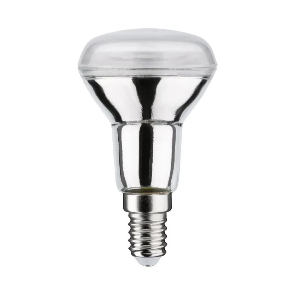 E14 5,8 W LED-reflektor R50 fra Paulmann med sølvfarget glasshus, dimbar, varmhvitDenne dimbare LED-reflektorlampen R50 med E14-sokkel avgir varmhvitt lys med en strålevinkel på 36°. Lampen egner seg spesielt godt til spotter og spotlights.