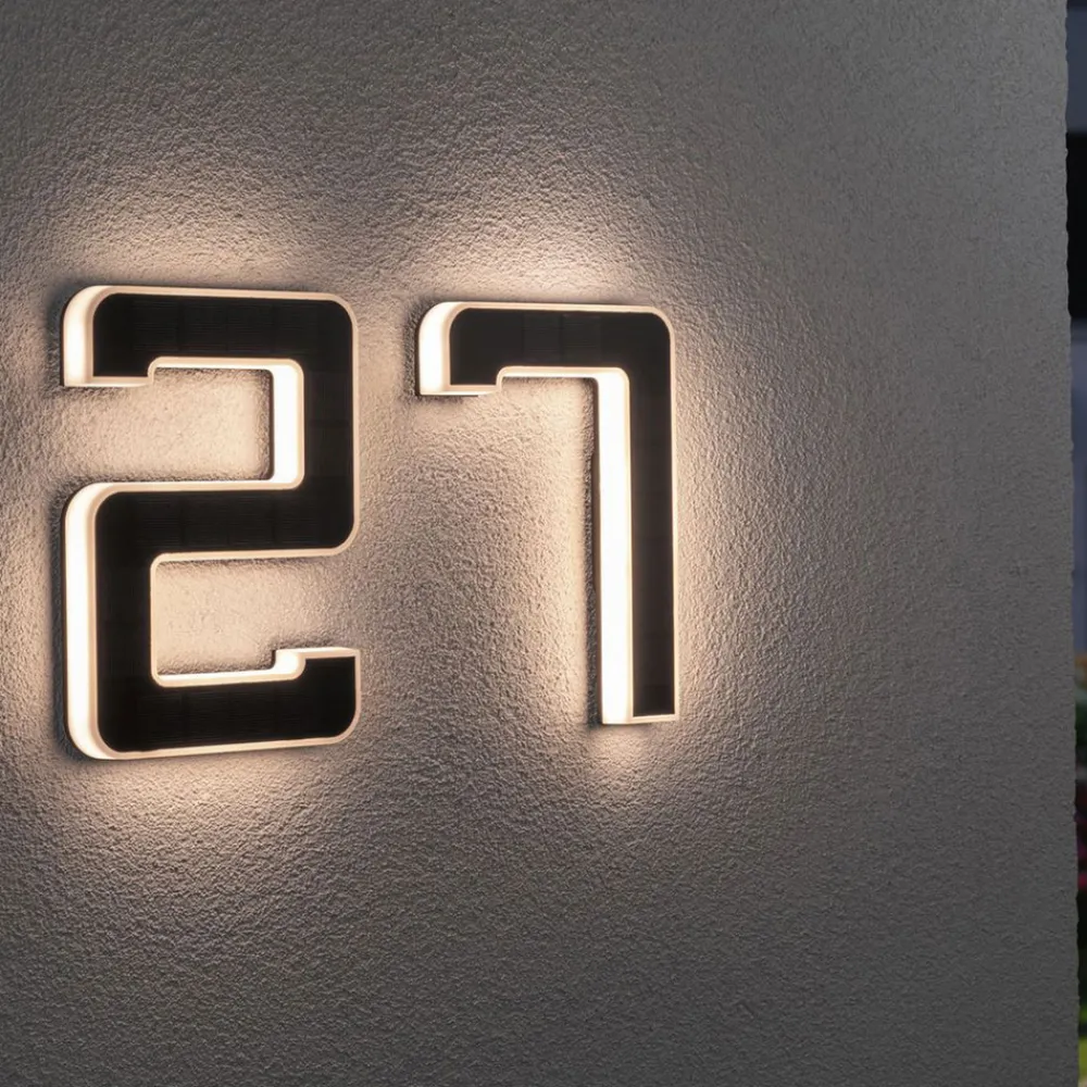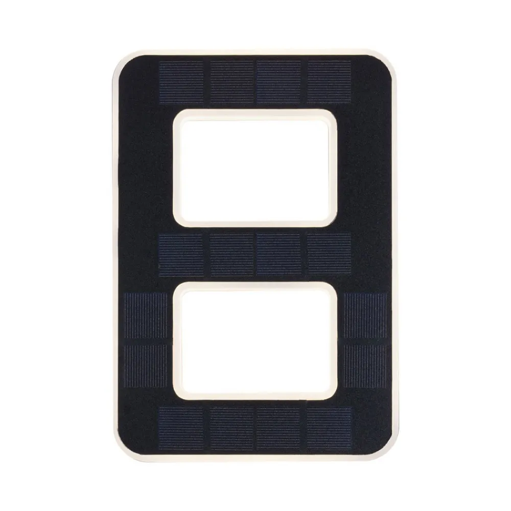 Utendørs solnummer i svart med varmhvit belysningSolcellehusnummeret er utstyrt med en solmodul som usynlig er innlemm…