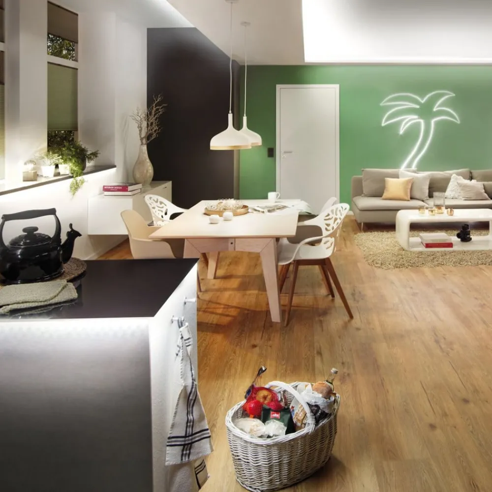 Med MaxLED 500 LED-stripe basissett kan mange rombelysninger realiseres, fordi den kraftige stripe muliggjør et behovsbasert lysmønster på ulike overflater. Dette er mulig på den ene siden på grunn av den selvklebende undersiden og på den annen side på grunn av båndets fleksibilitet. Grunnsettet inkluderer en passende ballast, og settet kan også utvides med forlengelseslister (se tilbehør). En passende fjernkontroll for å bytte eller dimme stripen er også tilgjengelig separat.