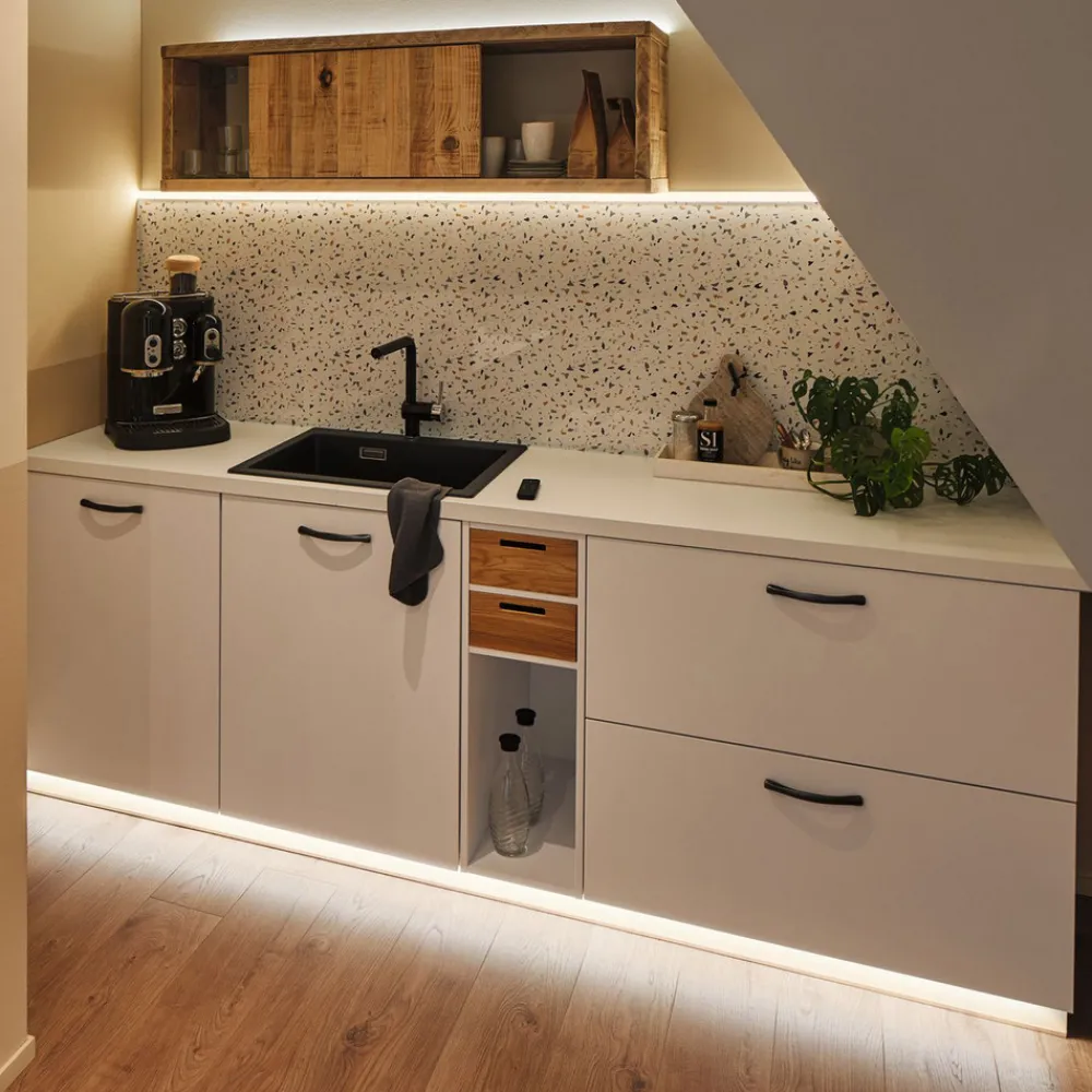 Denne belagte LED-stripe MaxLED 500 kan utvides til en maksimal lengde på 3 m med ekstra striper og koblinger. En kontrollenhet inkludert fjernkontroll er også tilgjengelig som tilbehør. I kombinasjon med krympeslange kan listen også brukes på bad og andre fuktige rom. Listen kan forkortes etter behov og er selvklebende på baksiden for enkel montering. Det fleksible materialet gjør det enkelt å feste til jevne og ujevne overflater.