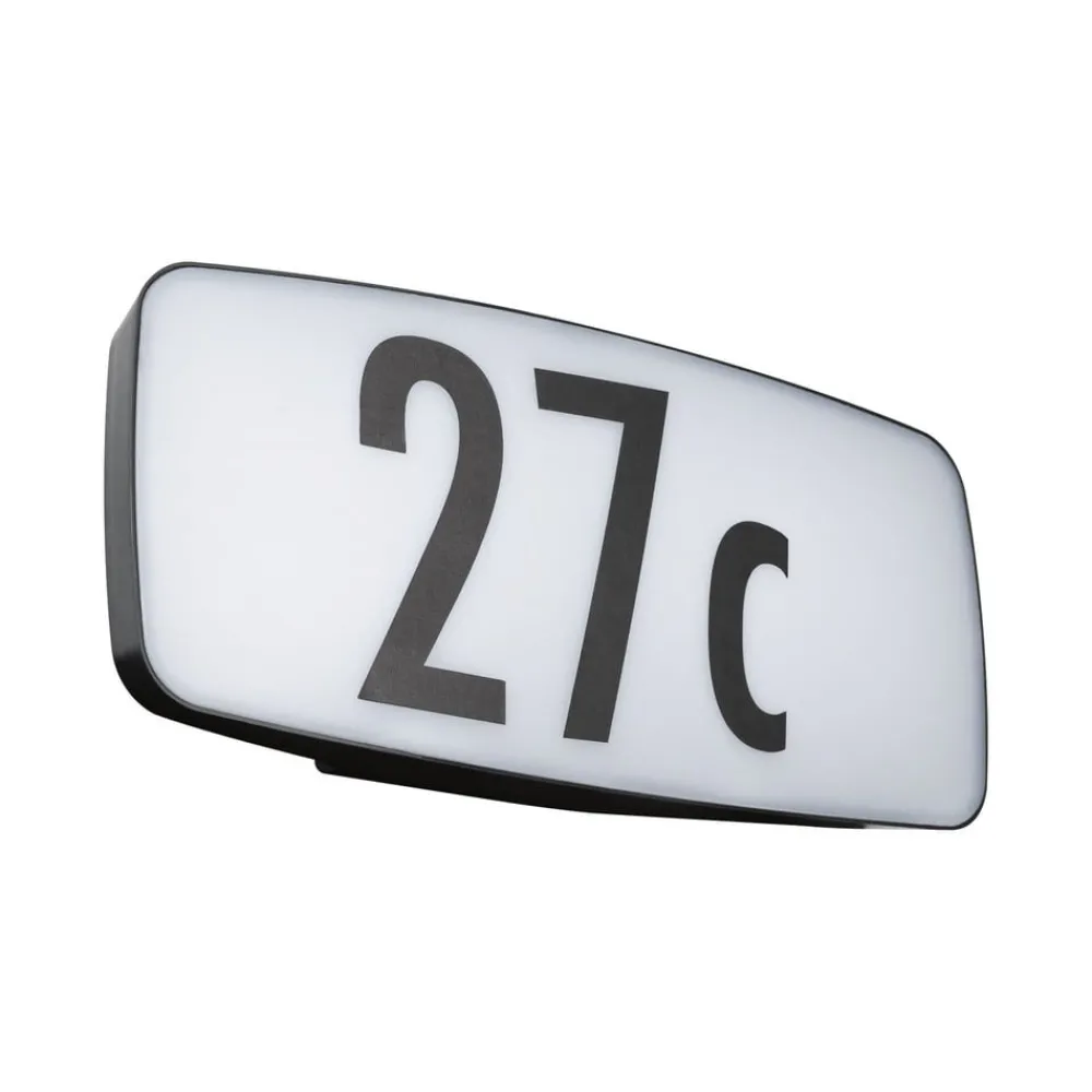 Sheera LED-vegglampe eller husnummerlampe, ZigBee-kompatibel Sheera LED utendørs vegglampe er utstyrt med en bevegelsesdetektor og en skumringssensor og er kompatibel med ZigBee-radiooverføringsprotokollen, noe som betyr at den kan styres smart på ulike måter, enten via app med smarttelefon, nettbrett eller med stemmen. Et annet styringsalternativ er fjernkontrollen Gent fra Paulmann, som fås som tilbehør. Sheera LED utendørs vegglampe er laget av plast og leveres med et sett med tall og bokstaver for å feste husnummeret. Lysfargen kan justeres, og den er utstyrt med sensorer. En integrert skumringssensor slår lyset automatisk på i skumringen, mens bevegelsessensoren slår lyset til 100 % lysstyrke og 3 000 Kelvin når bevegelse registreres, og tilbake til den tidligere innstilte verdien etter ca. 30 sekunder. Sheera LED utendørs vegglampe kan brukes med smarthus-gatewayer som har Zigbee-grensesnitt – ett Zigbee-produkt kan styres via flere fjernkontroller – for attraktive lysakkorder på utendørsvegger – med tall- og bokstavsett for bruk som husnummerlampe – automatisk veksling takket være integrert bevegelsessensor – IP-beskyttelse: IP44 – sprutsikkert