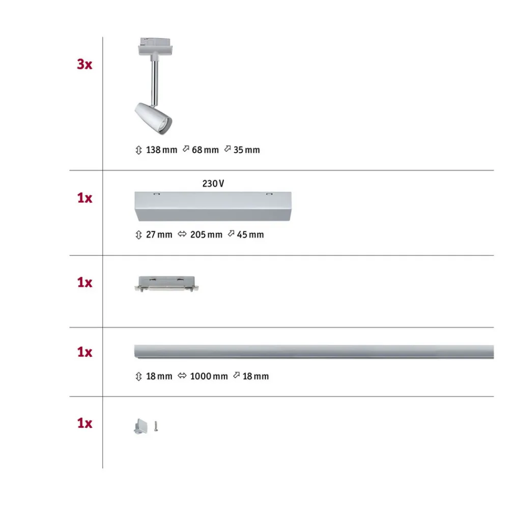 - inkl. tre spoter, 1 x 100 cm skinne, mate- og linjekopling