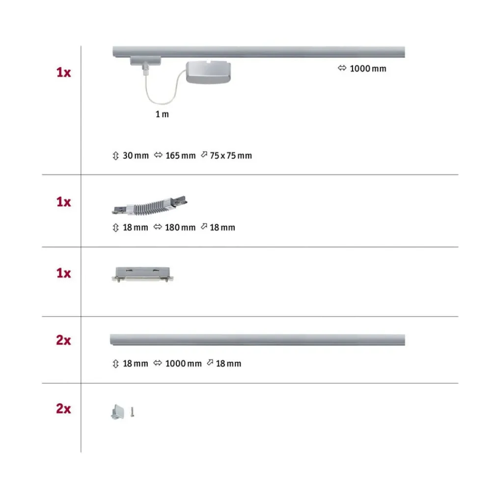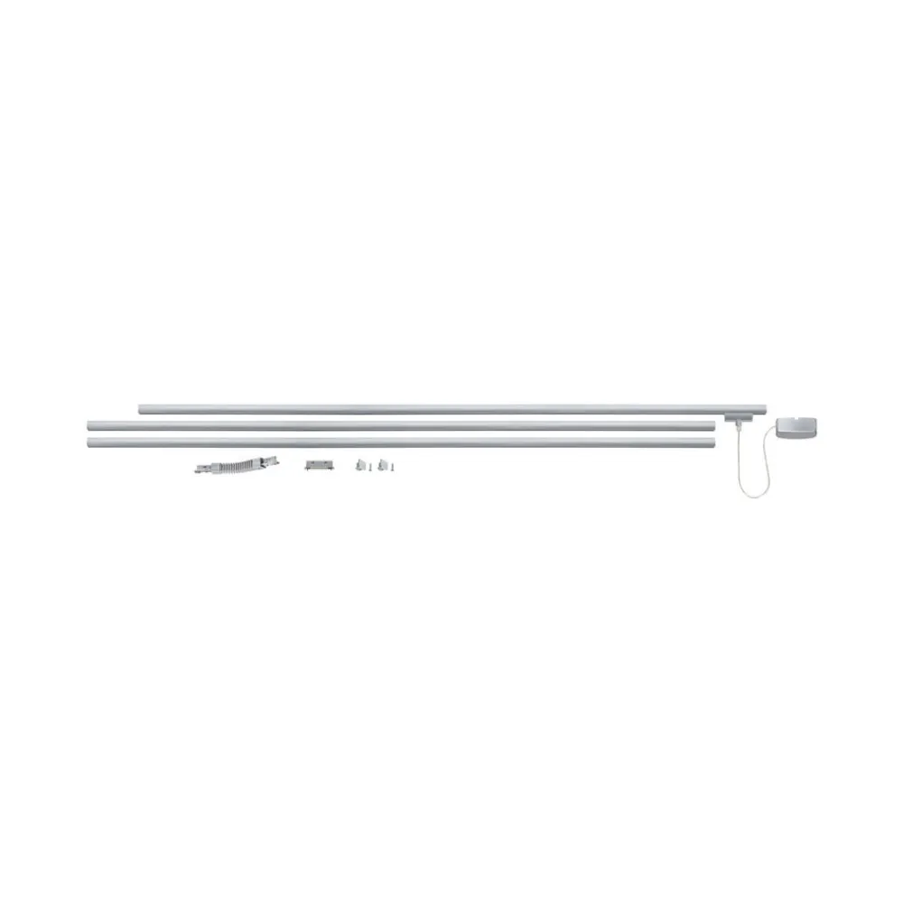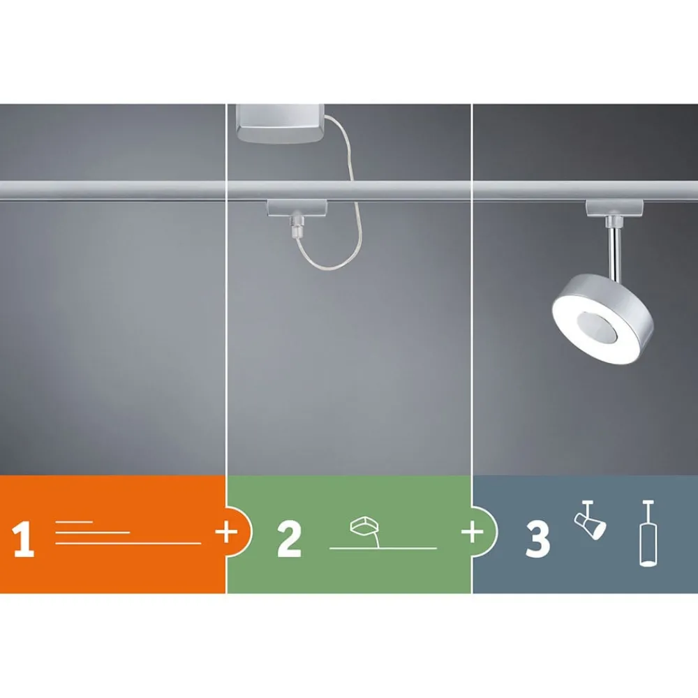 Dette URail består av tre 1 meter lange skinner i matt krom, en mating og koblinger, er et tilbehørssett for URail 1-faset skinnesystem som skaper et passende grunnlag for ditt eget URail system i dine egne fire vegger. Basissystemet er designet for en maksimal total effekt på 1000 W og inneholder alle komponentene som kreves for installasjon.