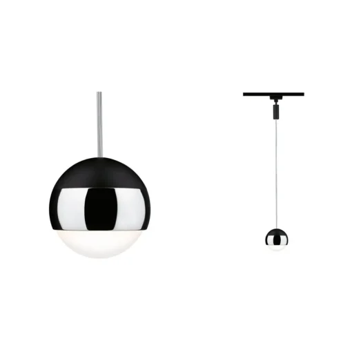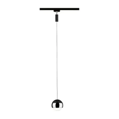 Capsule II LED-pendellampe i svart/krom for URail skinnesystem Capsule II LED-pendellampe monteres i en URail-skinne over et bord eller en benk og gir energieffektiv og behagelig varmhvit belysning. Den sfæriske pendellampen er også et moderne blikkfang i rommet. Kombinasjonen av matt svart og krom gjør pendellampen perfekt til bruk i en svart eller kromfarget skinne. Flere pendler lyser også opp et langbord, og i kombinasjon med andre lamper til systemet kan et helt rom belyses effektivt med et skinnesystem.