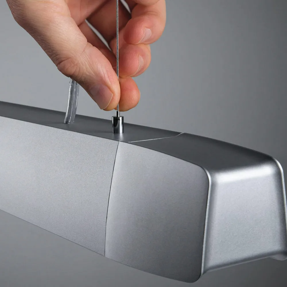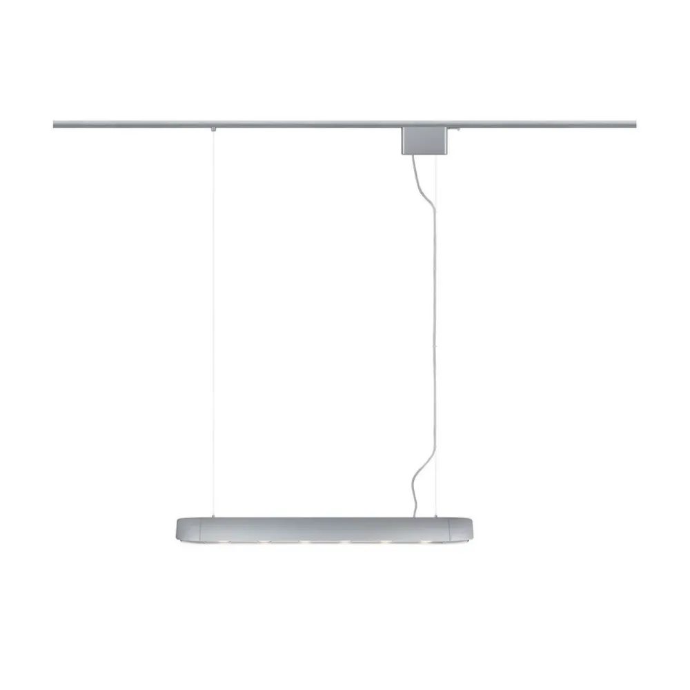 Et annet alternativ for bruk av URail skinnesystem fra Paulmann er denne Barre- pendellampe . Det gir til og med kobling av flere Barre-lys takket være muligheten til å koble dem, ved at endekapslene kan fjernes og lysene kan plugges sammen tilsvarende. Denne fordelen spiller inn spesielt på langbord, som kan belyses som en helhet. For igangkjøring kreves seks GU10-lamper for URail skinnesystem .