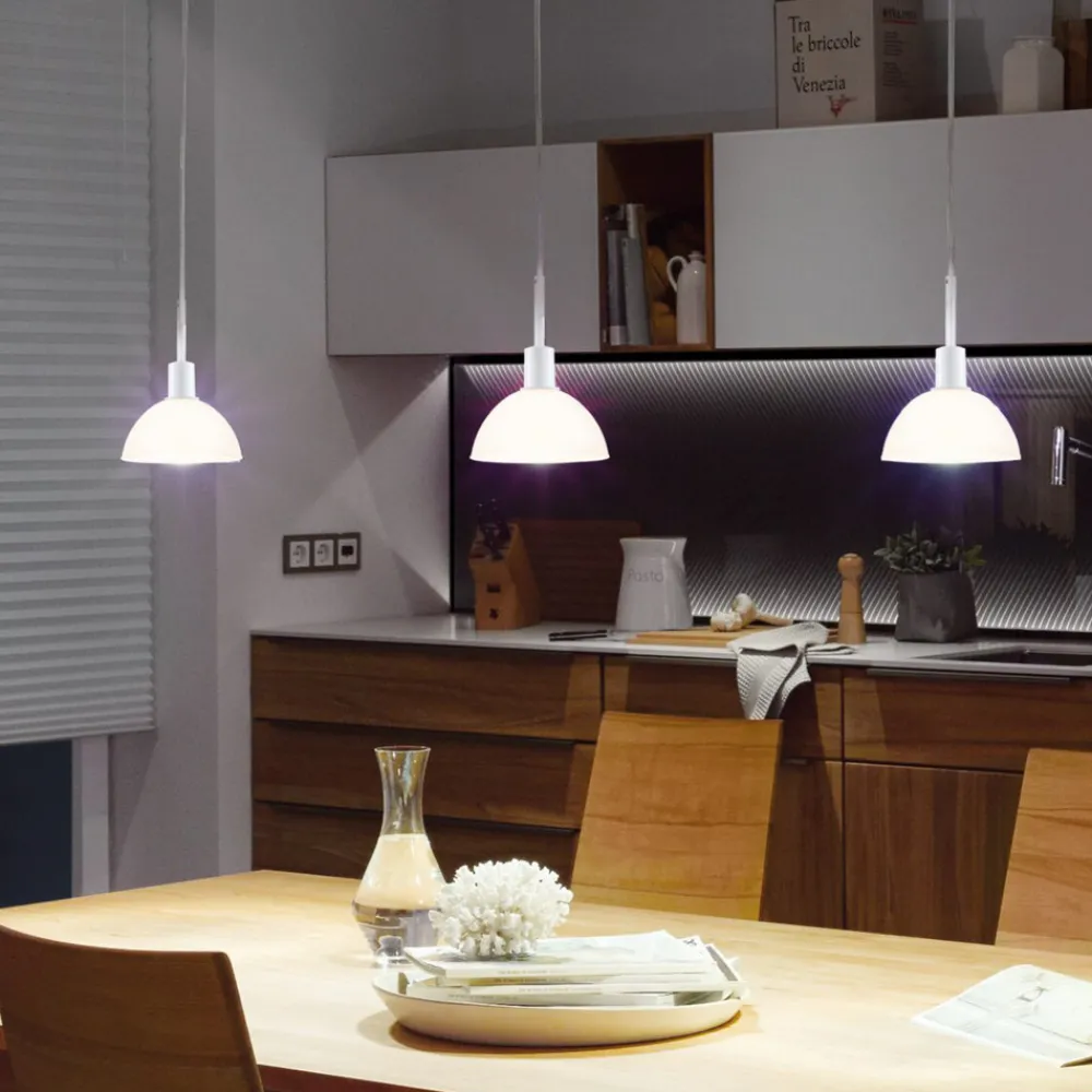 Sarrasani pendellampe med opalhvit skjerm til URail skinnesystem Sarrasani er en pendellampe med en halvsirkelformet, opalhvit glasskjerm som kan integreres i URail skinnesystem for å belyse bord eller benker. Pendellampen skaper et visuelt høydepunkt i skinnesystemet. Pendelen kan forkortes individuelt og utstyres med en valgfri lyskilde med E14-sokkel, slik at den kan tilpasses optimalt til de aktuelle kravene og romforholdene.
