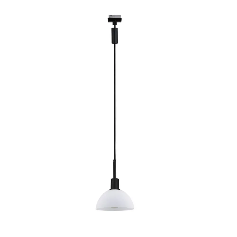 Sarrasani pendellampe med opalhvit skjerm til URail skinnesystem Sarrasani er en pendellampe med en halvsirkelformet, opalhvit glasskjerm som kan integreres i URail skinnesystem for å belyse bord eller benker. Pendellampen skaper et visuelt høydepunkt i skinnesystemet. Pendelen kan forkortes individuelt og utstyres med en valgfri lyskilde med E14-sokkel, slik at den kan tilpasses optimalt til de aktuelle kravene og romforholdene.