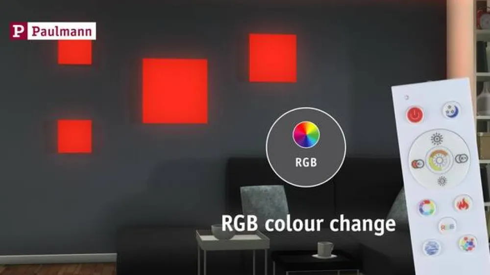 Kvadratisk LED-panel Velora Rainbow med fjernkontrollMed LED-panelet Velora Rainbow får du spektakulære lyseffekter i stuen. I tillegg til utmerket rombelysning med ren fargemagi, kombinerer LED-panelet de beste lysegenskapene med dynamiske fargeeffekter på en ny måte. Fargetemperaturen kan justeres trinnløst med fjernkontrollen fra 3000 K varmhvitt til 6500 K dagslyshvitt lys, og i tillegg kan man velge mellom 16 forhåndsinnstilte animasjoner og dynamisk fargestyring. Hver scene kan justeres i hastighet eller fryses som et stillbilde. Kontinuerlig dimming og den integrerte nattlysfunksjonen kompletterer funksjonene til panelet, som passer inn i ethvert interiør takket være en elegant, rammeløs design.