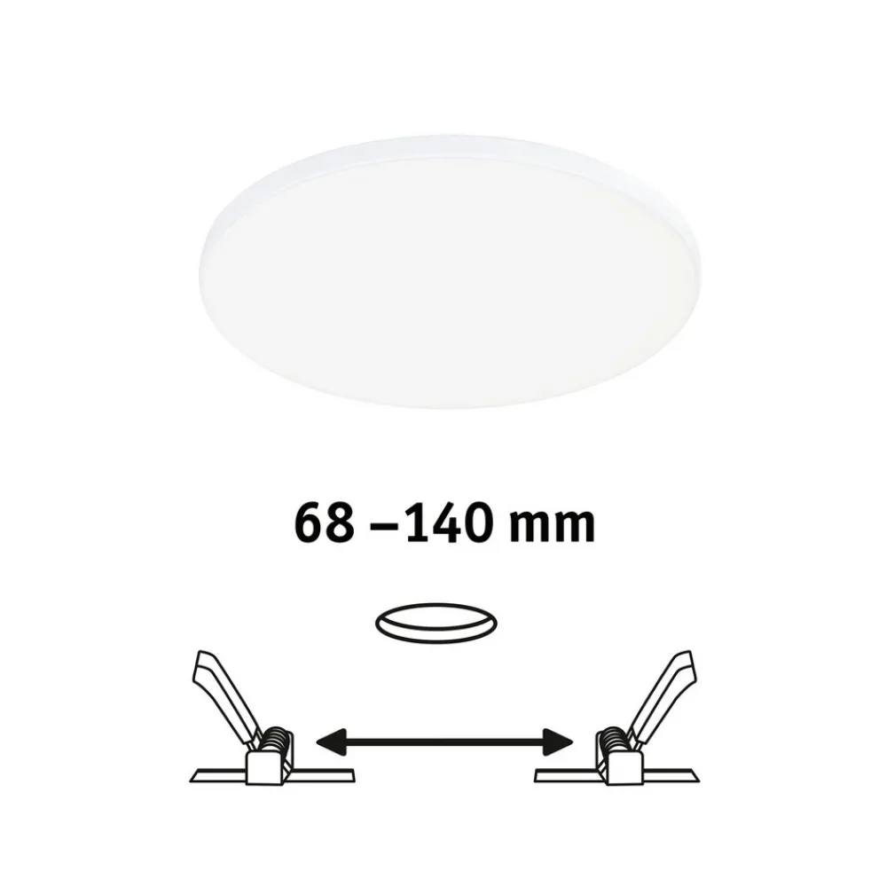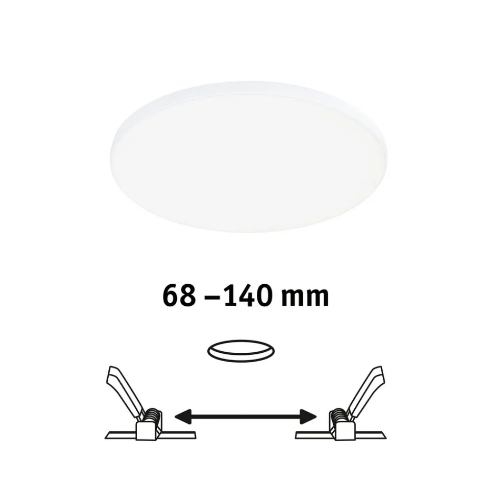 Takket være det rammeløse designet og det satinerte plastdekselet passer det runde LED-innfelte panelet Veluna VariFit Edge nesten sømløst inn i ethvert tak . Panelet er utstyrt med IP44-beskyttelse og egner seg derfor også for bad og andre fuktige områder og gir kjølig hvit belysning som fordeles jevnt av dekselet. Takket være VariFit-teknologien med justerbare klemfjærer passer panelet inn i borehull i forskjellige størrelser og takket være det flate designet er det også egnet for grunne hulromsdybder.