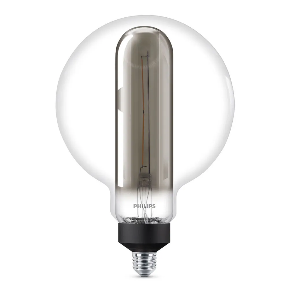 E27 LED-lampe Giant Globe smoky dobbeltlag Denne LED-pæren med dobbeltlagsdesign består av et rørformet glassrør farget i en røykaktig farge og inneholder varmhvite lysdioder i glødetrådteknologi. Denne rørpæren sitter i sin tur i et klart glass i en rund kuleform. Det dekorative utseendet til denne Giant Globe smoky pæren er utvilsomt hovedfokuset. Lampen er effektiv i alle typer fatninger, enten det er bord-, gulv- eller hengelampe – dimbar