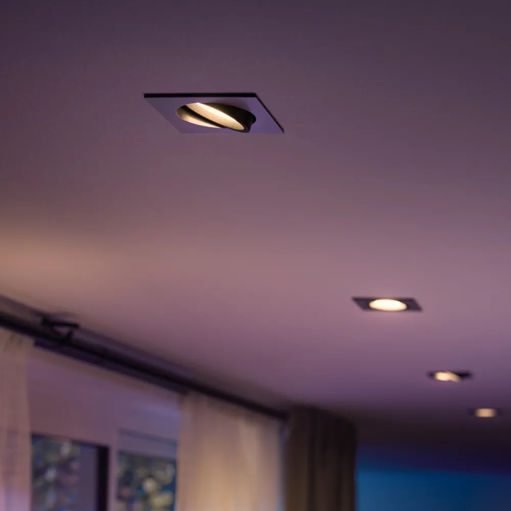 Centura firkantet innfelt LED-spotlight med Philips Hue White- og Colour Ambiance-lampe for styring via Bluetooth og Zigbee Den innfelte LED-takspotlighten Centura fra Philips består av en enkel, firkantet ramme i plast som omgir et justerbart lyshode. Centura er utstyrt med en utskiftbar GU10-lampe med Hue White- og Color Ambiance-teknologi, noe som gir den innfelte spotlighten en enestående funksjonalitet. Centura tilbyr alle tenkelige alternativer for enhver atmosfære, fra dagslyshvitt arbeidslys til avslappende varmhvitt lys i stuen og fargerik festbelysning. I tillegg til de forhåndsinstallerte kombinasjonene kan lyset – avhengig av integrasjon – tilpasses og velges fritt etter behov eller en definerbar plan. Centura kan integreres i ethvert ZigBee-kompatibelt smarthussystem via en bro og ruter. Den praktiske trenden med stemmestyring kan realiseres ved hjelp av Google Home, Amazon Alexa eller Apple HomeKit, mens fjernstyring er mulig via Hue-appen. Centura kan også betjenes direkte med en smarttelefon eller et nettbrett – uten ekstra maskinvare – via Hue Bluetooth-appen på stedet. Tekniske data: – Fargetemperaturen på det hvite lyset kan justeres fra varmhvitt (2000 K) til dagslys (6500 K) – 16 millioner farger – Bluetooth-rekkevidde innendørs ca. 10 m. 10 m Spesielle egenskaper/kompatibilitet: – Kan styres med Hue-dimmerbryteren (se tilbehør) – Kan styres med tilhørende Hue-app og Hue Bluetooth-app – Kompatibel med eksisterende Philips Hue-system og andre ZigBee-baserte systemer, f.eks. fra Innogy, Bosch, Telekom (Magenta) og Busch-Jäger – Stemmestyring mulig med Amazon Alexa, Apple HomeKit (Siri) og Google Assistant – Kan dimmes via app, stemmekommando og dimmerbryter – Intelligent lysstyring a: ZigBee-integrasjon via bro og ruter, for eksempel Philips Hue Bridge (se tilbehør); dette muliggjør styring på stedet eller på farten via Hue-appen (gratis for Android og iOS) eller på stedet med stemmestyring via Amazon Alexa, Apple HomeKit (Siri) og Google Assistant.