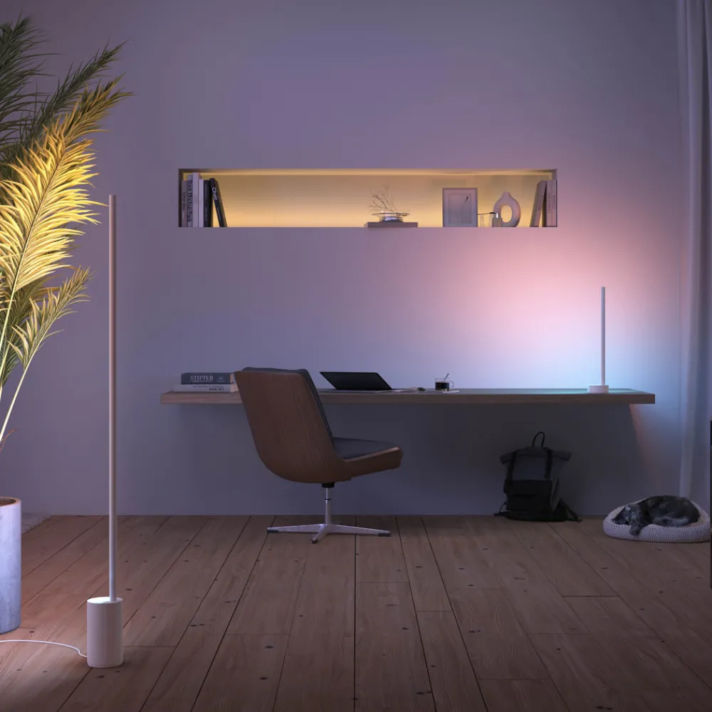Den slanke og moderne designen til LED-gulvlampe Signe huser smarte, kontrollerbare RGBW -lysdioder som er utstyrt med Hue Gradient -teknologi. I tillegg til forskjellige hvite nyanser og et mangfold av farger, kan disse kombineres til statiske og dynamiske fargegradienter som kan justeres individuelt. For eksempel rosa lys i det nedre området og gult lys i det øvre området, tilbyr Signe helt kreative muligheter for lysdesign. gulvlampe, med lysutslipp rettet mot veggen, er ideell for indirekte belysning med myk lysfordeling.