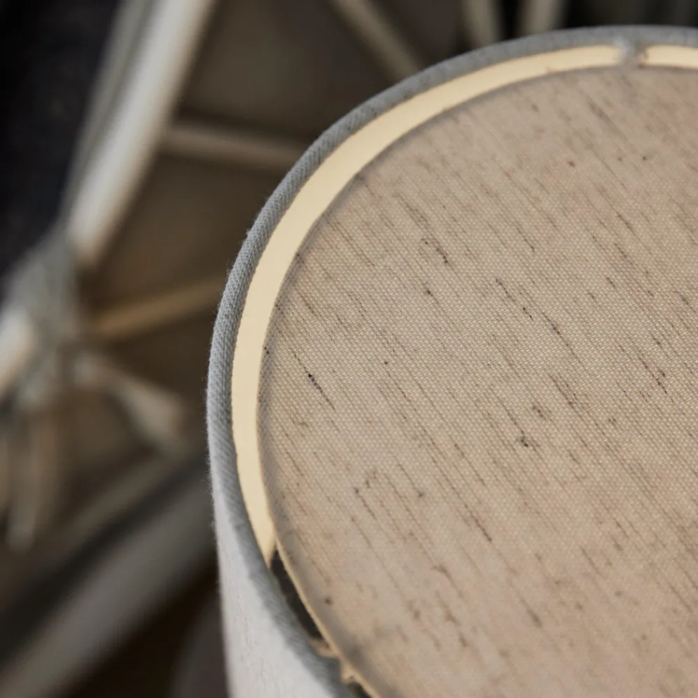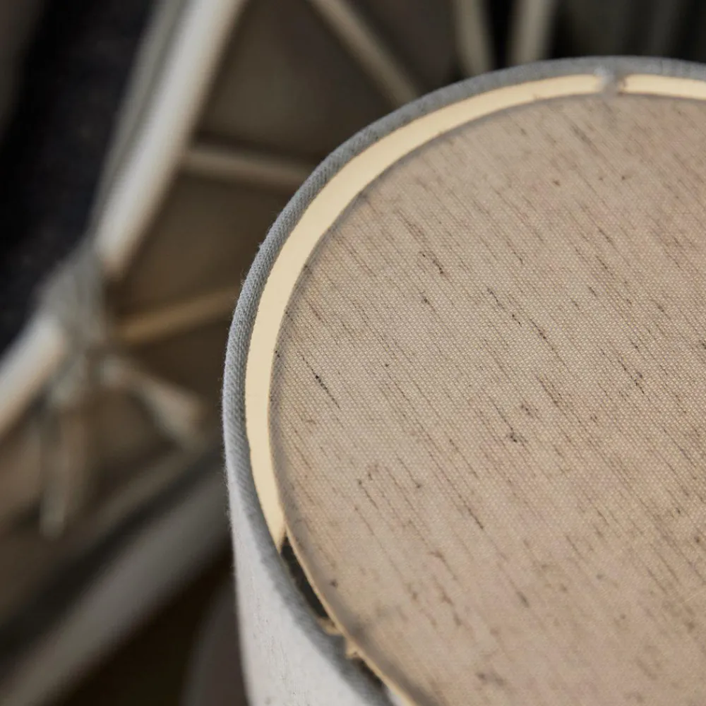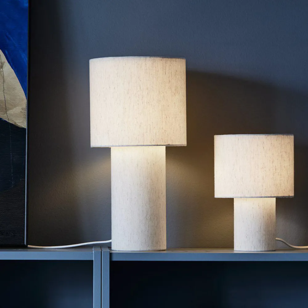 Leah koselig bordlampe – to tekstilsylindere Bordlampen Leah er en hyggelig kilde til ekstra lys i salonger, stuer og soverom. En smal sylinder fungerer som base, en bred sylinder som lampeskjerm; begge er laget av stoff. På/av-bryteren er plassert i støpselet.