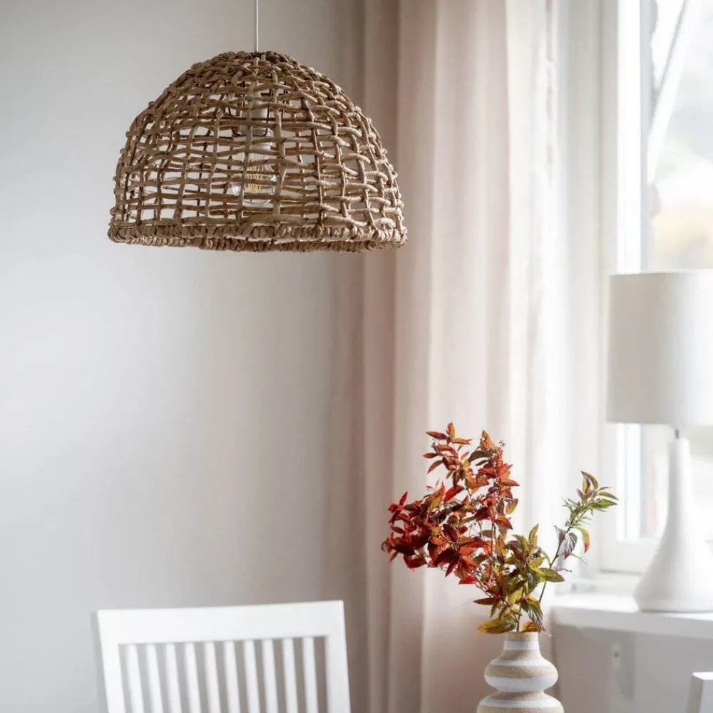 Robust utendørs pendellampe Cebu laget av et spesielt materiale Pendellampen Cebu er laget av et helt spesielt materiale, lampakanay. Dette er en myrplante som vi kjenner som bulrush. Fibrene er svært sterke og slitesterke, et ideelt materiale for veving. Og det kan du se med denne spesielle hengelampen – ta med deg ren natur inn i hjemmet! Lampen passer perfekt i utestuen eller på terrassen og skaper en jordnær atmosfære. Den svarte kabelen er ca. 2,5 meter lang, har støpsel og er egnet for utendørs bruk. Pendellampen har en E27-fatning. Vær og UV-lys kan påvirke lampens utseende.