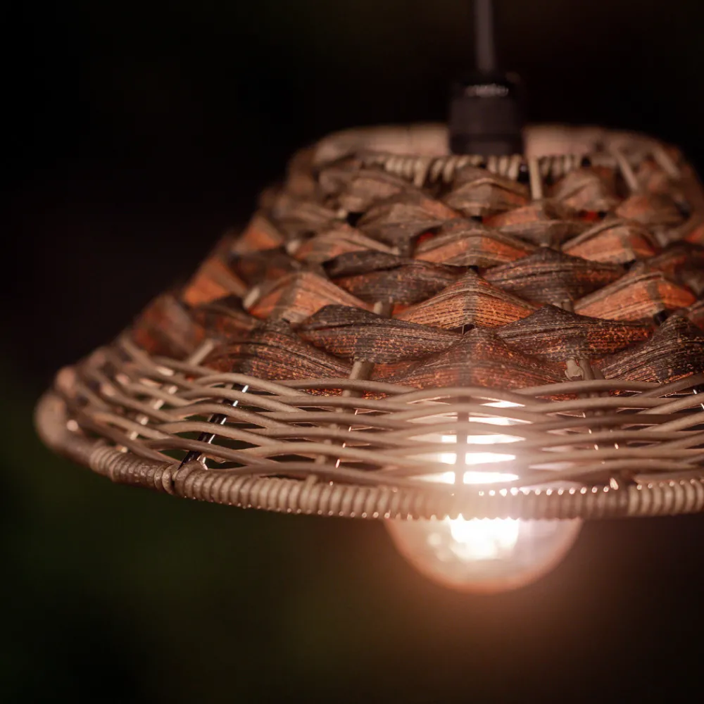 Utendørs pendellampe LISEN med IP44-beskyttelse LISEN er en liten pendellampe for utendørs bruk med klassisk flettverk, der materialene rotting og vannhyasint er blandet for å skape en vakker rustikk miks. Det kunstige materialet er laget av resirkulert plast og er et slitesterkt materiale for utendørs bruk. Lampeskjermen selges sammen med Flex Out-lampeopphenget på 2,5 m og er utstyrt med en EU-kontakt.