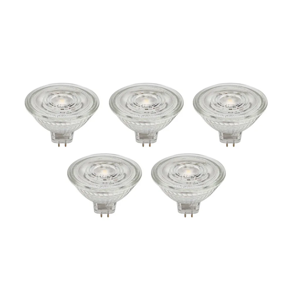 GU5.3 4,9W LED-reflektor i glass, transparent i et praktisk sett med 5 stk. Denne LED-reflektoren passer til mange lamper med GU5.3-sokkel. Den er laget av glass og kan brukes fleksibelt takket være det transparente fargedesignet – ikke dimbar – 4,9 W – 500 lumen – strålevinkel 36° – leveres i et sett med 5 stk