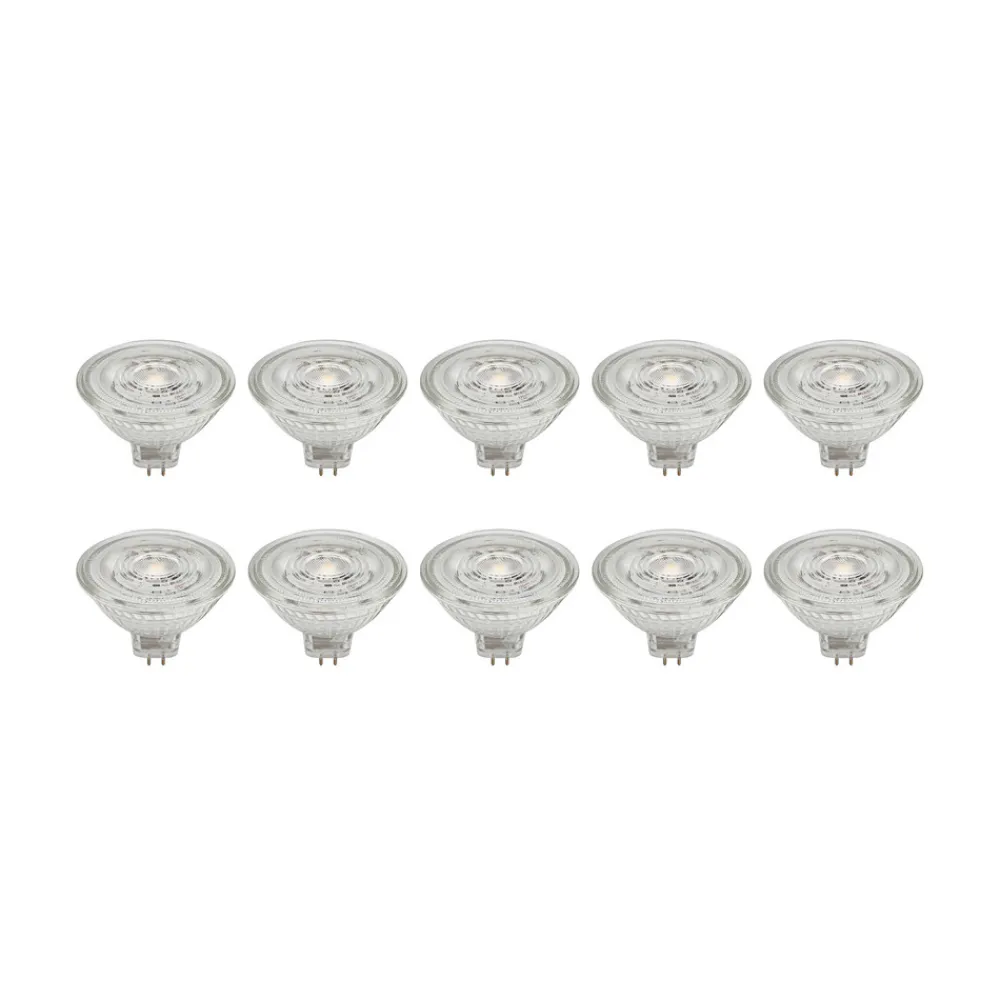 GU5.3 4,9W LED-reflektor av glass, transparent i praktisk sett med 10 stk. Denne LED-reflektoren passer til mange lamper med GU5.3-fatning. Den er laget av glass og kan brukes fleksibelt takket være det transparente fargedesignet – ikke dimbar – 4,9 W – 500 lumen – strålevinkel 36° – leveres i et sett med 10 stk