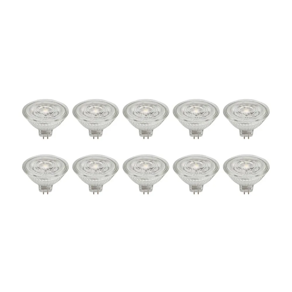 GU5.3 4,9W LED-reflektor av glass, transparent i praktisk sett med 10 stk. Denne LED-reflektoren passer til mange lamper med GU5.3-fatning. Den er laget av glass og kan brukes fleksibelt takket være det transparente fargedesignet – ikke dimbar – 4,9 W – 500 lumen – strålevinkel 36° – leveres i et sett med 10 stk