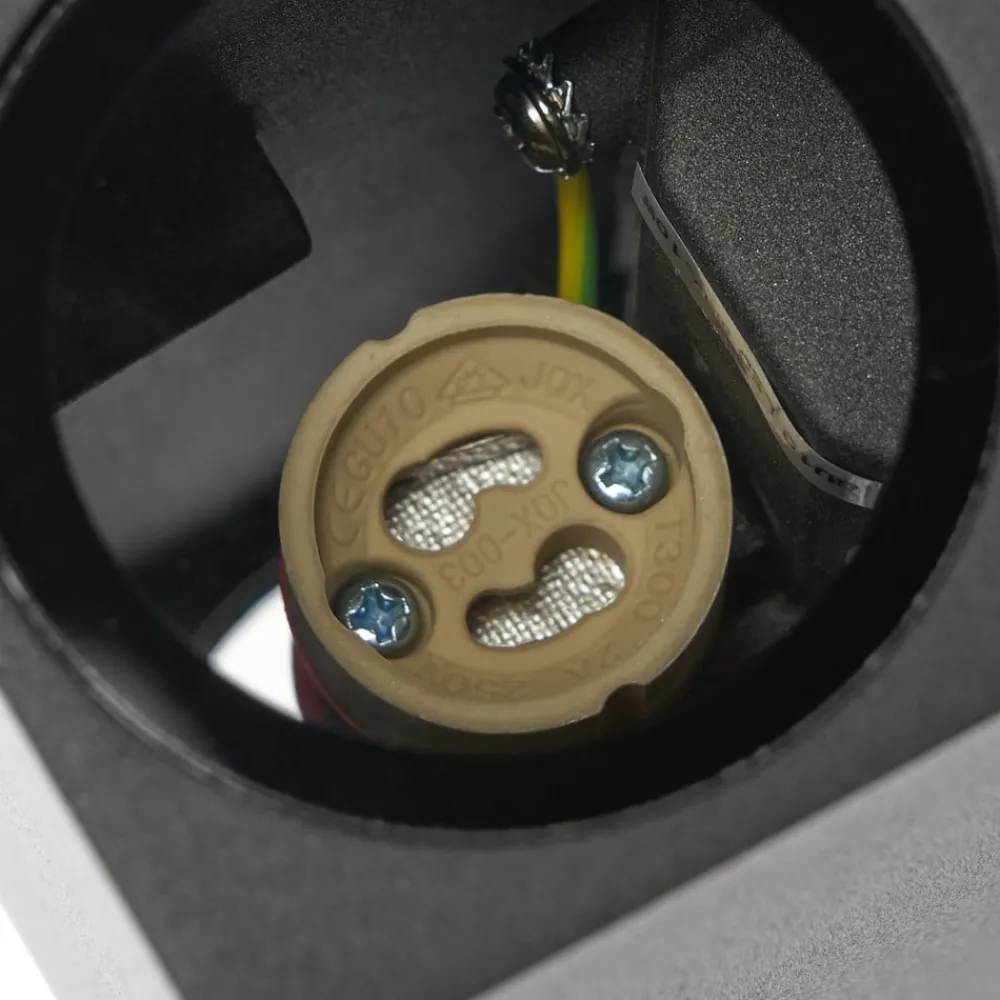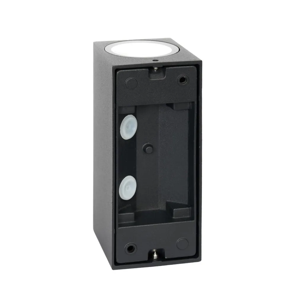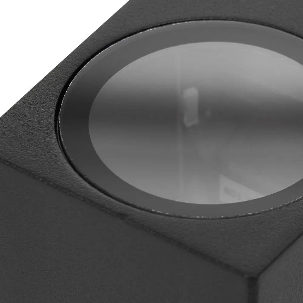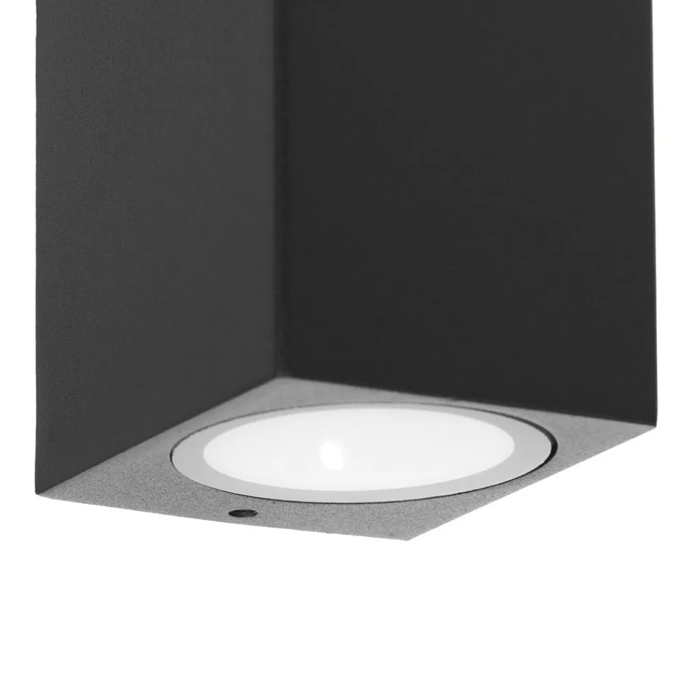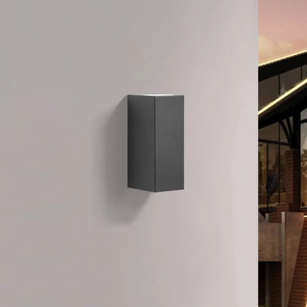 Enkel utendørs vegglampe Tetje i aluminium med kuboid utseende Utendørs vegglampen Tetje er ideell som detaljbelysning foran inngangsdøren. Den er laget av aluminium og har en kantet kropp som minner om en kuboid. Den svarte fargen gir den en enkel karakter og gjør den lett å integrere i husets yttervegg. Tetje utendørs vegglampe er støvtett og beskyttet mot vannstråler, noe IP65-klassifiseringen viser. Tetje kan utstyres med GU10-lyskilder og kan enkelt kombineres med andre lamper i serien for å skape et harmonisk helhetsinntrykk.