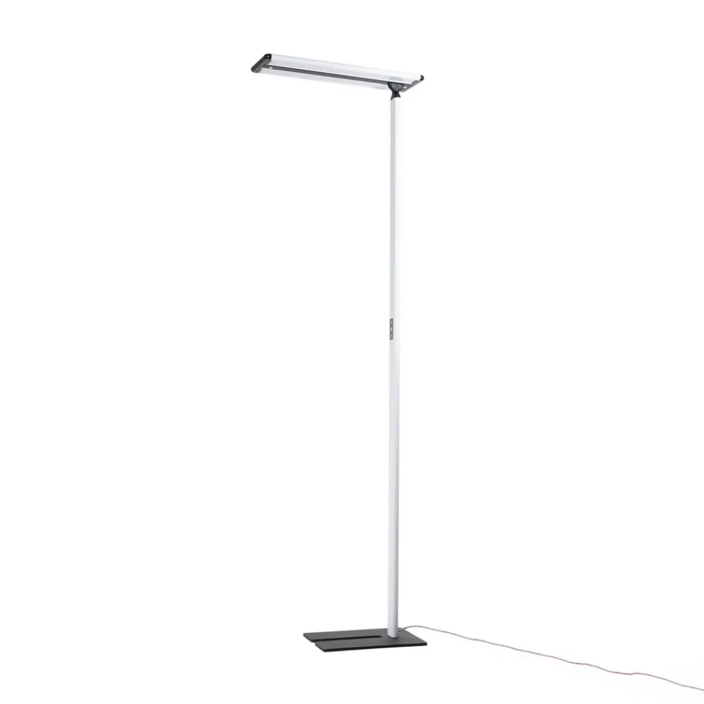 Slim Zyair LED-gulvlampe i hvit med touchdimmer Zyair er den perfekte følgesvenn når det gjelder belysning på arbeidsplassen. Den er laget av aluminium og leveres i en harmonisk hvit farge. Den er utstyrt med fastmonterte LED-lamper som gir en universalhvit belysning, noe som er ideelt for kontoret. Den har også en berøringsdimmer på sokkelen som gjør det enkelt å dimme lyset (direkte og indirekte lys kan dimmes separat), noe som sikrer riktig lysnivå til enhver tid. Zyair LED-gulvlampe kan kombineres med andre lamper i serien for å skape et harmonisk helhetsinntrykk i interiøret – UGR < 19 – IK02 – SDMC: 3 – U-formet fot