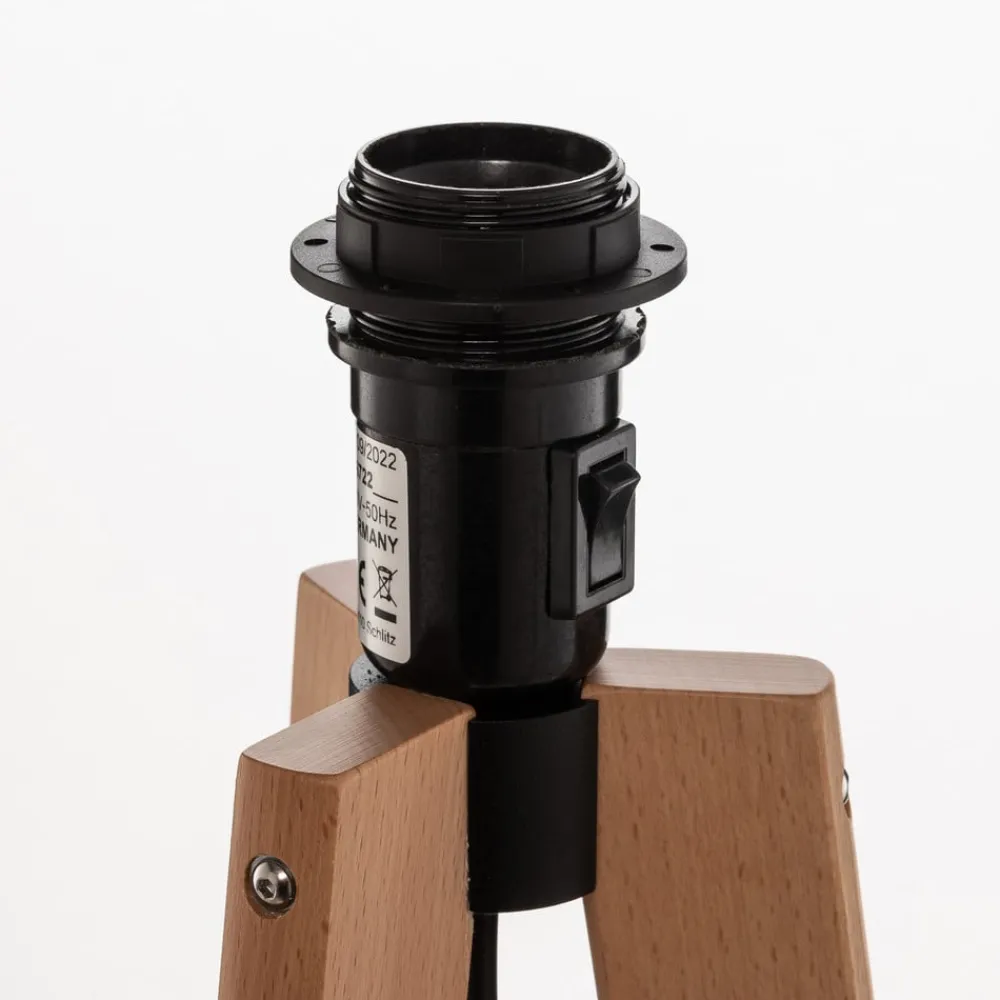 Gulvlampe Arim i bøketre med svart chintzskjerm og stativramme i massivt tre, produsert i Tyskland Den svarte chintzskjermen ser ikke bare elegant ut, men gir også innbydende lysforhold med en veldig koselig effekt. Stoffet er påført en flammehemmende baksidefilm i B1-kvalitet. Det trebente stativet er derimot laget av massivt bøketre av høy kvalitet og deretter behandlet med en lakk av høy kvalitet, slik at det ikke mister noe av sitt naturlige utseende. Bryteren er plassert på stikkontakten, slik at lampen kan betjenes raskt og enkelt. Lampen er et vakkert kvalitetsprodukt som er produsert i Tyskland, og kan brukes både i stuen og på soverommet med sin behagelige lyseffekt.