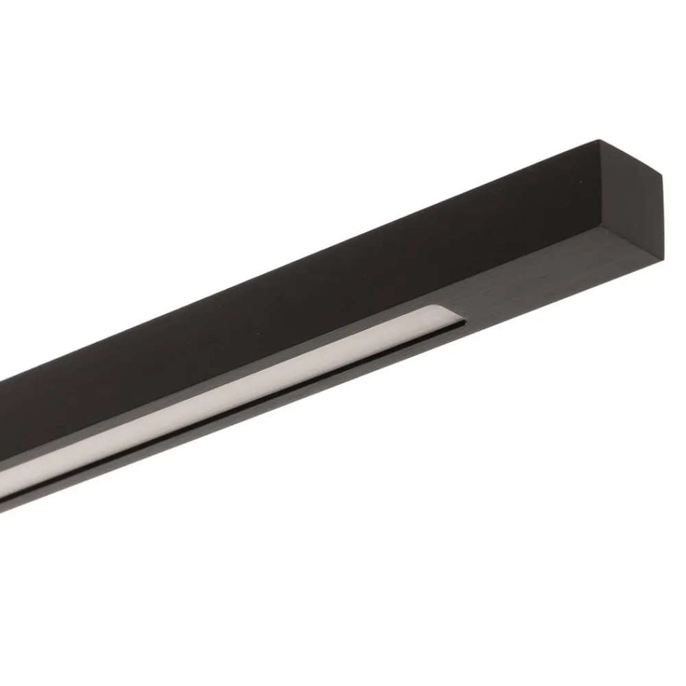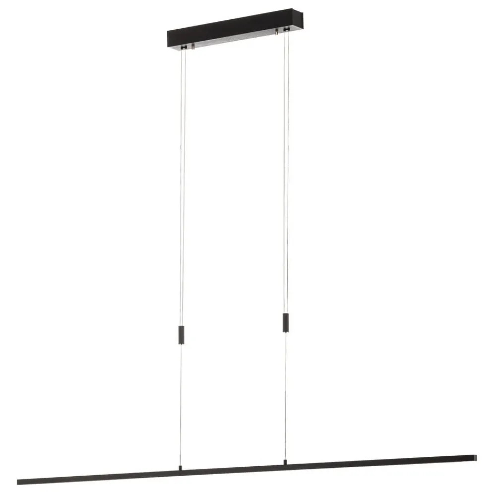 Tolu svart LED-pendel, høydejusterbar og eksternt dimbar, høykvalitetsprodukt produsert i Tyskland Tolu er en armatur som kun består av en smal lysstav i et slankt design, som er dekket av en gjennomgående LED-stripe på undersiden og har en meget fin finish av høy kvalitet. Den svarte finishen er omhyggelig foredlet for hånd og har fine penselstrøk på overflaten. Den har et slående utseende og en kjølig eleganse som gjør seg spesielt godt i moderne interiører. Armaturen utmerker seg også generelt med en førsteklasses utførelse av svært høy kvalitet, kan skilte med «made in Germany»-merket og gir et effektivt, flimmerfritt lys som ved behov også kan justeres i lysstyrke med en ekstern dimmer (for- eller bakkantfasestyring) og har en utmerket fargegjengivelse med en CRI-verdi på over 90, slik at fargene gjengis så naturtro som mulig også uten dagslys.