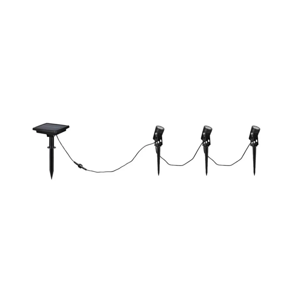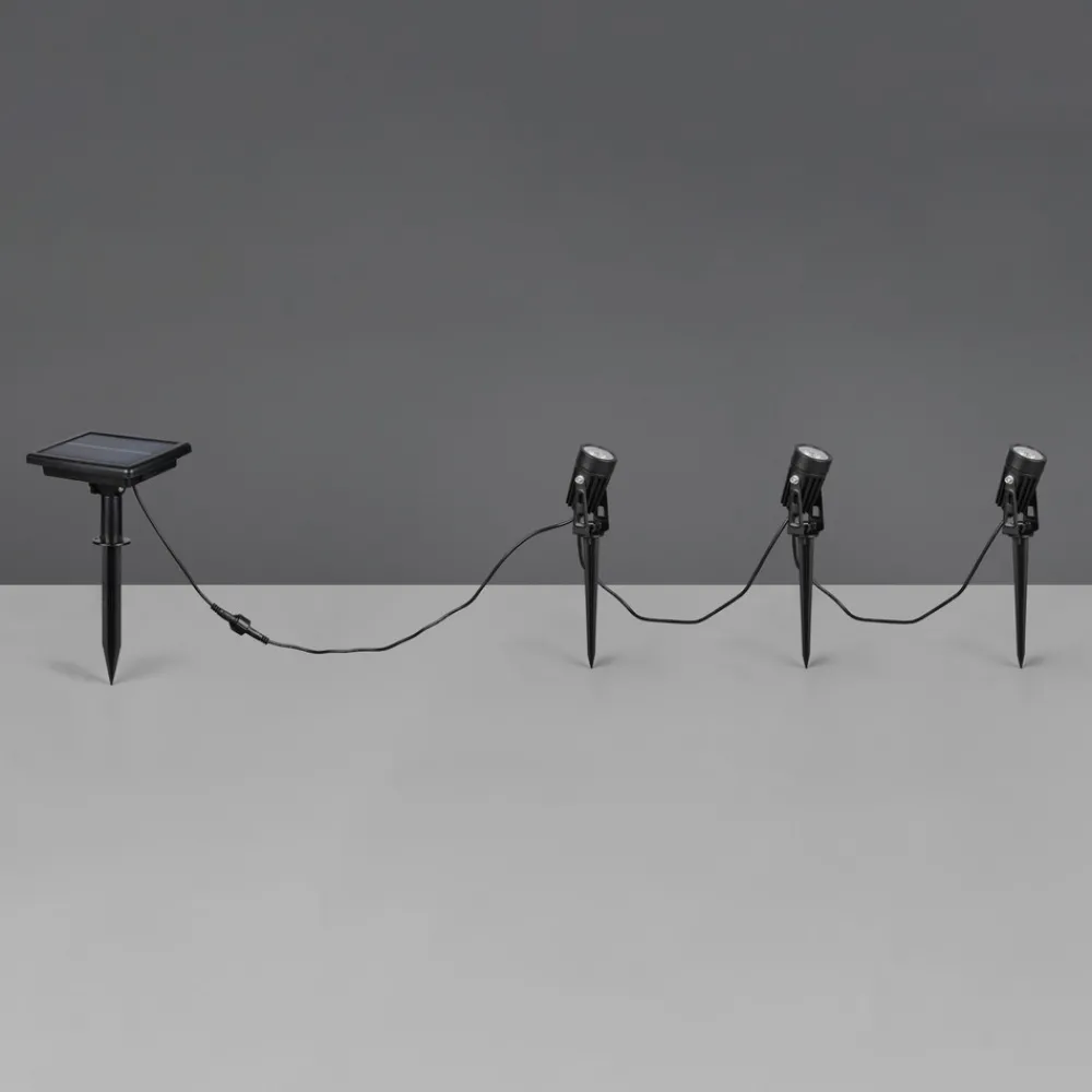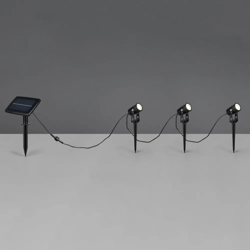Solcelledrevet spotlight Obidos i elegant matt svart kombinerer funksjonalitet og design. Denne spotlighten i sett med 3 stk. er laget av høykvalitets trykkstøpt aluminium og har ikke bare et tiltalende utseende, men også en imponerende holdbarhet. Kapslingsgrad IP44 sikrer at spotlighten er optimalt beskyttet mot sprutvann og inntrengning av fremmedlegemer, noe som gjør den ideell for bruk utendørs.