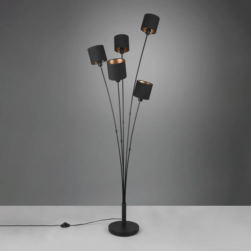Tommy gulvlampe, svart/gull, høyde 163 cm, 5-lys stoff