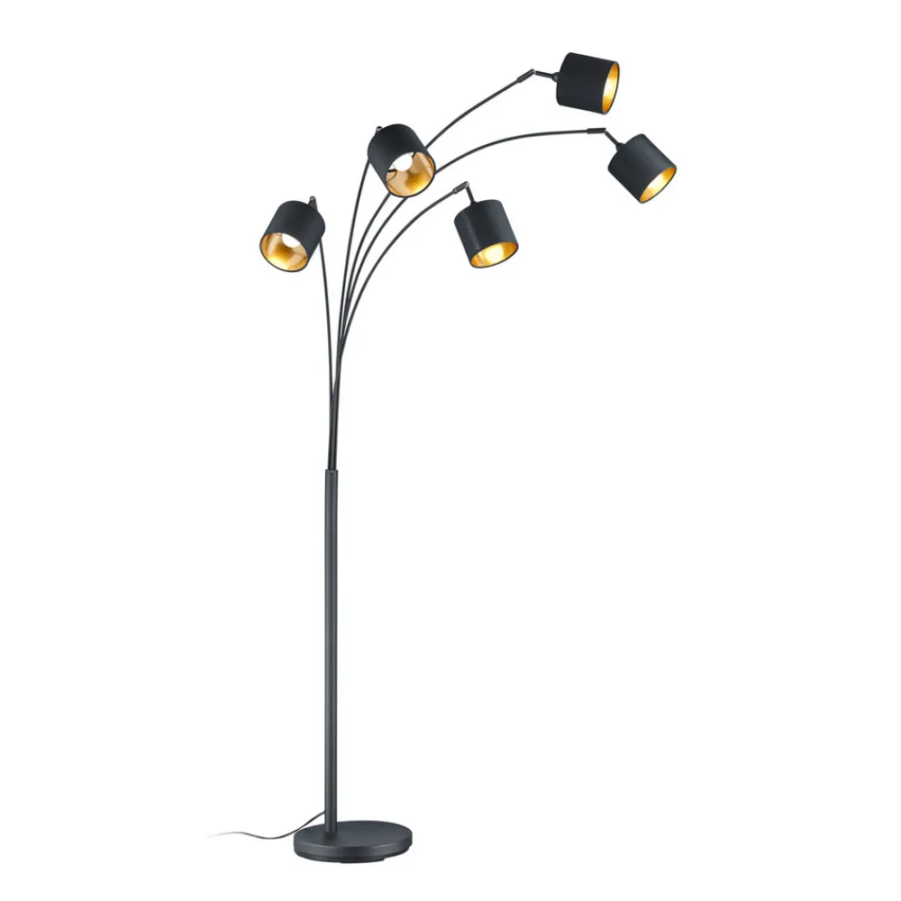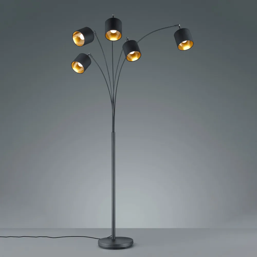 Tommy gulvlampe, svart/gull, høyde 200 cm, 5-lys, stoff