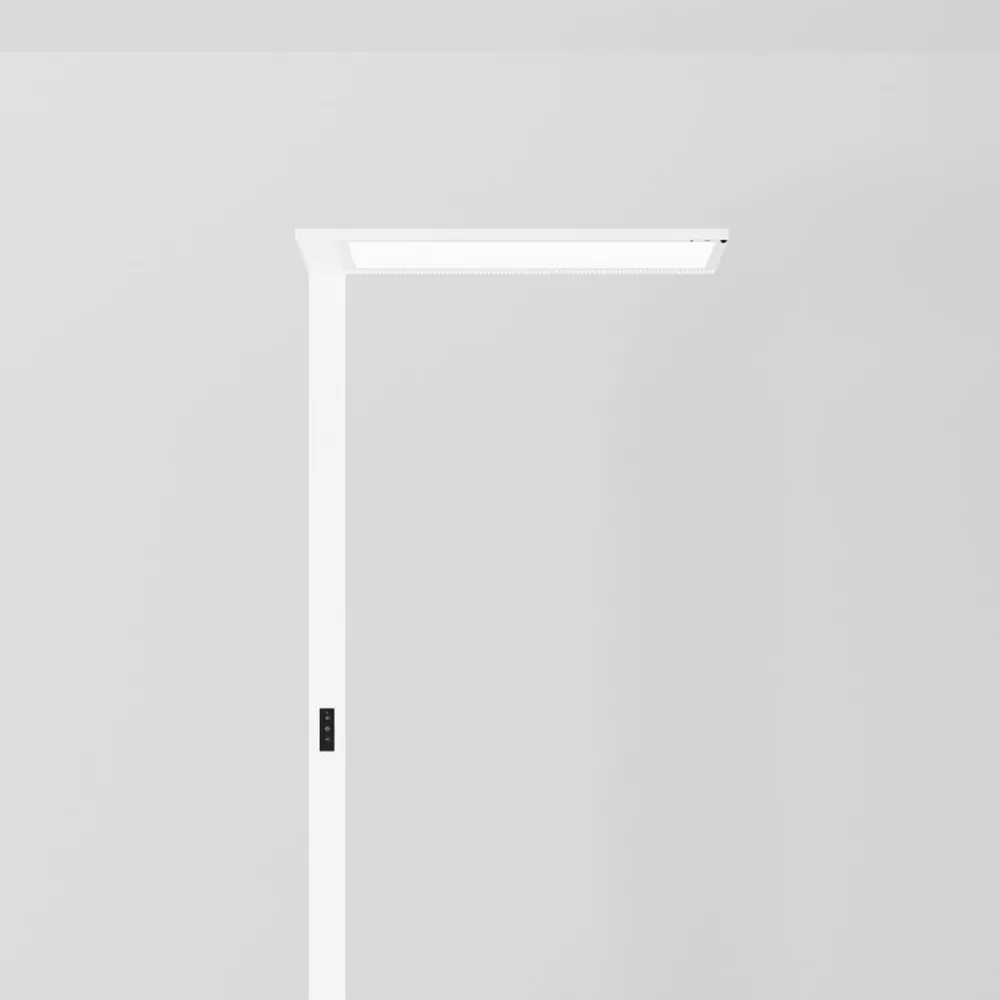 LED-gulvlampe Lightpad er beregnet for enkeltbordsbelysning på kontoret. Den sender ut både direkte og indirekte lys, med andelen indirekte lys på 70 %. Den er laget av aluminium og passer med sin hvite finish inn i enhver interiørstil. En sertifisert MINERGIE®-modul er integrert slik at energikostnadene er lave. Med en UGR <19 er det det ideelle valget for effektiv arbeidsplassbelysning. Utstyrt med bevegelsessensor og dagslyssensor SensoDim®.