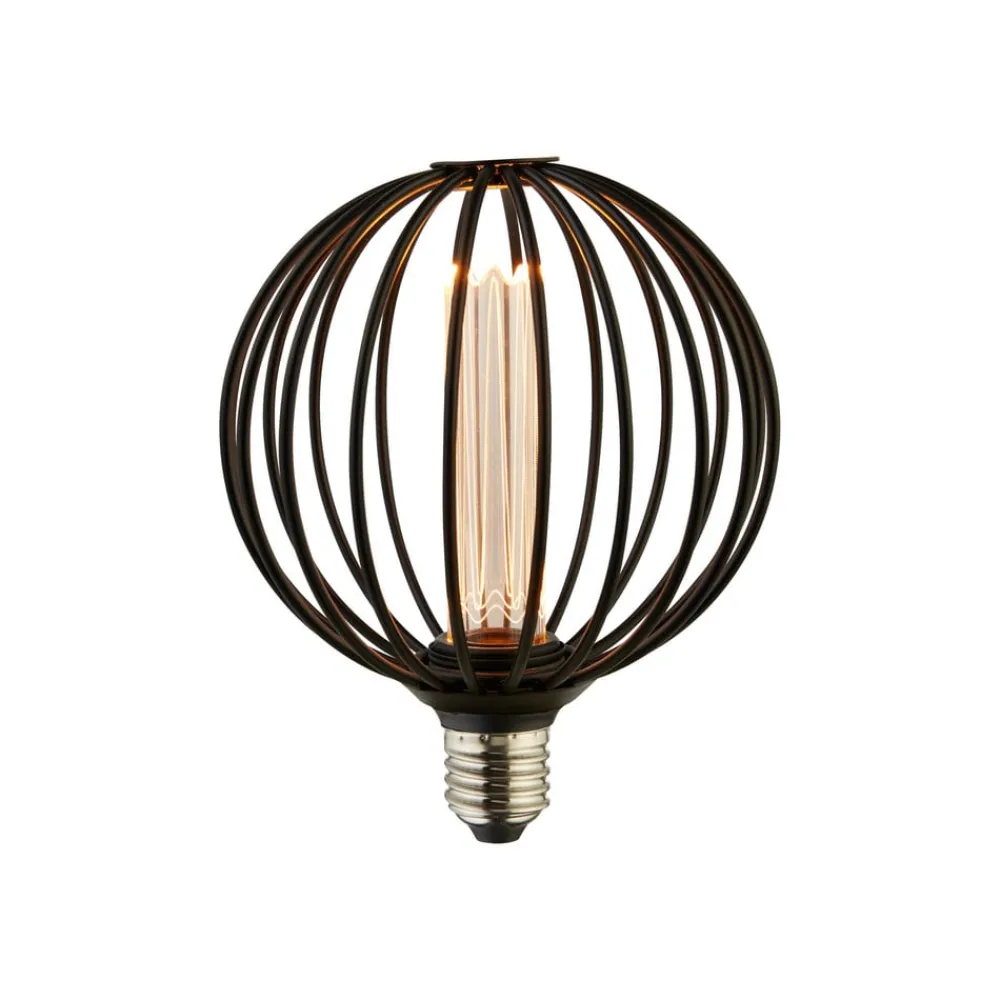 Globe Filament LED-lyskilde med E27-sokkel, 3,5 W, 1800 Kelvin, dimbar Globe LED-lyskilden for E27-sokler har et sfærisk, svartlakkert stålbur. Glødetrådene på innsiden er omgitt av glass. Globe avgir varmhvitt lys og kan dimmes eksternt.