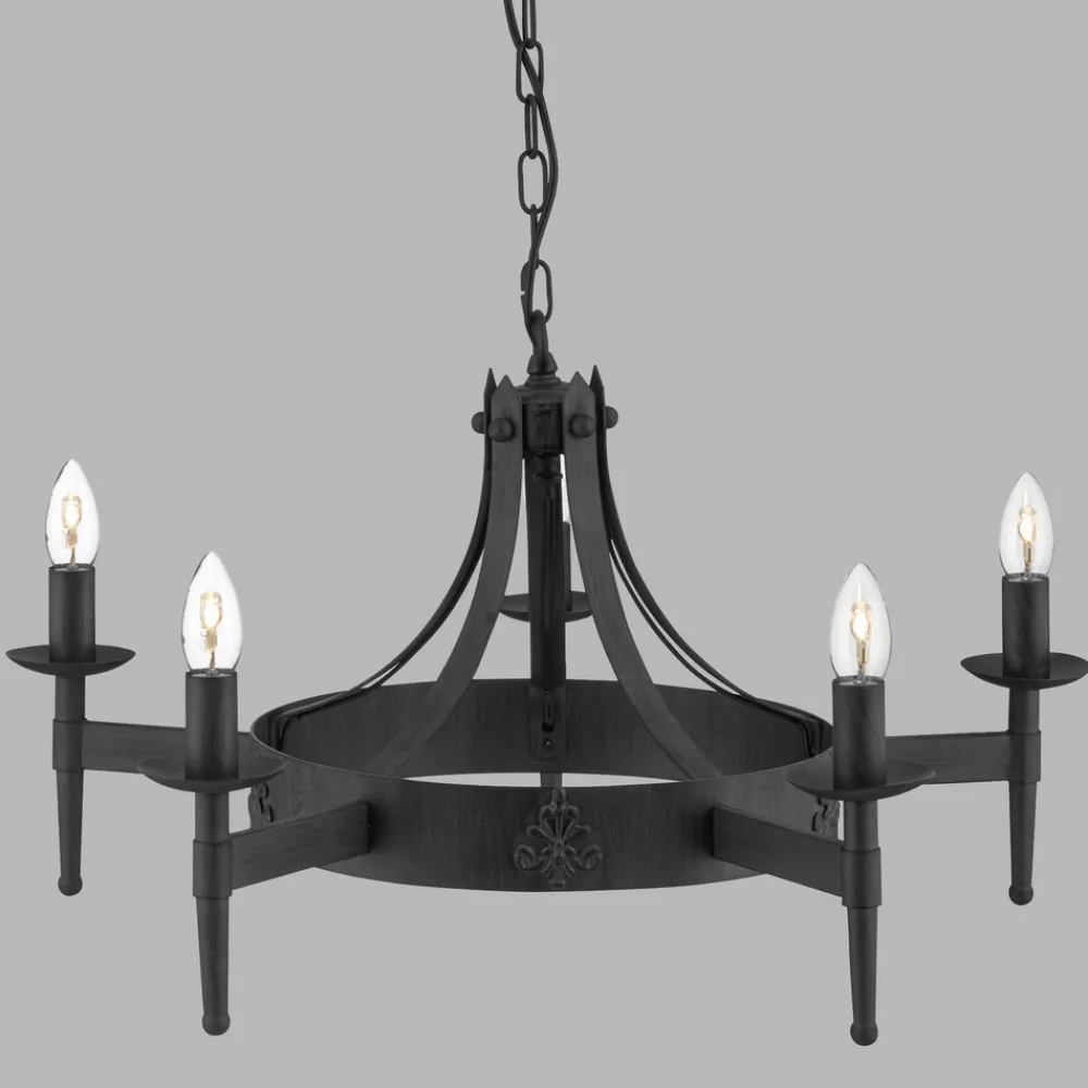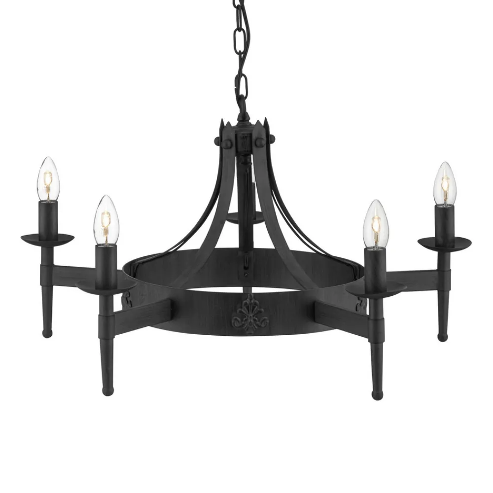 Denne fem-light lysekronen ser ut til å ha kommet fra middelalderen, da designet er basert på den gamle engelske stilen. Totalt fem lampesokler er fordelt på smijernsrammen til Cartwheel II, en i midten og fire på den ytre ringen. Et antikk møbelstilbehør utstyrt med moderne lysteknologi, som er ideell for grunnbelysningen i stuer og entréer. Det rustikke kjedeopphenget forsterker det antikke designet.
