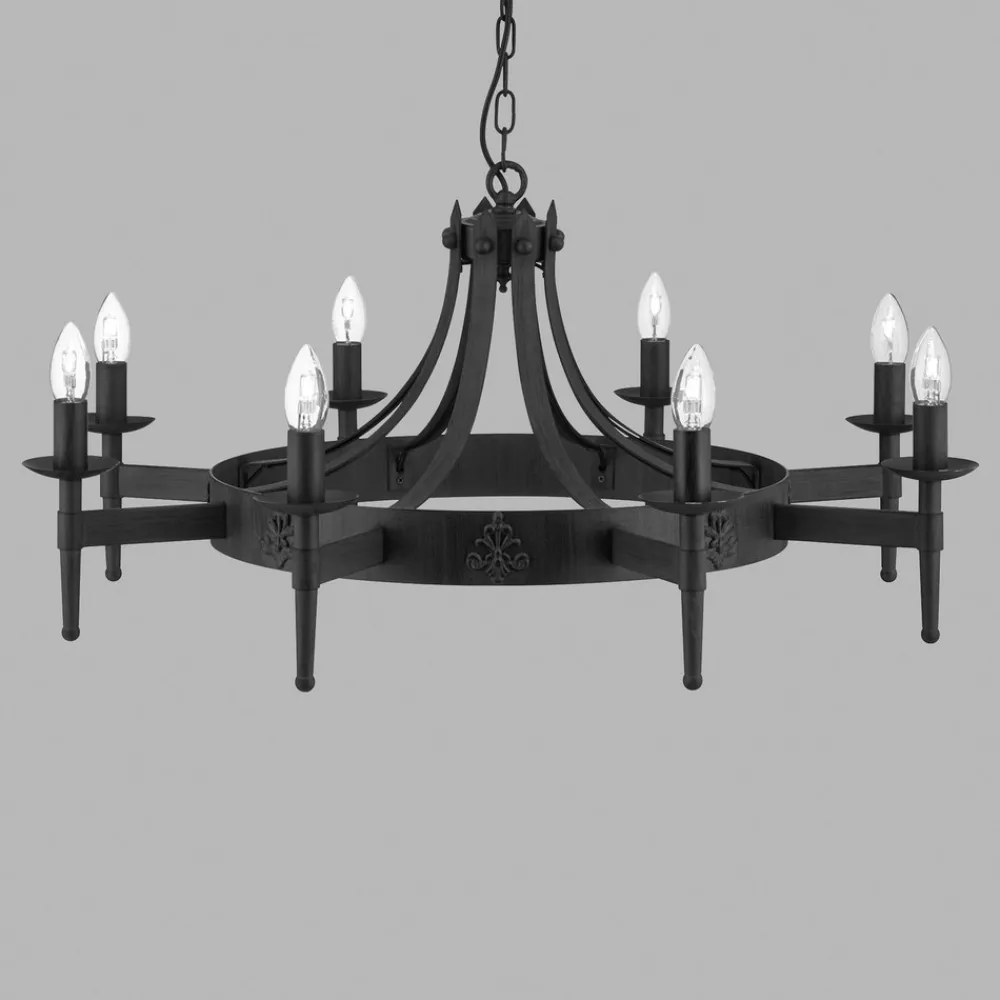 Den åtte lys Cartwheel II lysekronen er designet i gammel engelsk stil. Lysestaker fra middelalderen var inspirasjonen til utseendet her. Åtte lampesokler er fordelt på smijernsrammen til Cartwheel II, hvor passende stearinlys med E14-sokkel kan brukes. Cartwheel II imponerer med sitt antikke design og presenterer seg selv som et stilfremhevende tilbehør til en antikk livsstil. Det gir en festlig og behagelig grunnbelysning. Det rustikke kjedeopphenget forsterker det antikke designet.