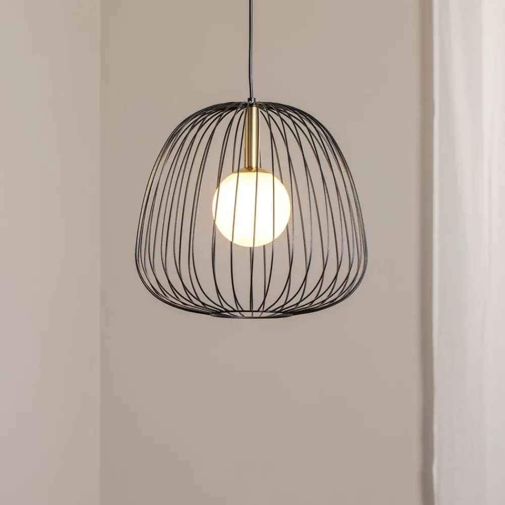 Hengelampen Bell M kombinerer moderne design med høykvalitetsmaterialer og er laget av stål og glass. Den stilfulle kombinasjonen av svart, gull og hvitt gir ethvert rom et elegant preg. Takket være sin allsidighet er lampen ideell for bruk i stuen eller spisestuen og skaper en behagelig atmosfære.