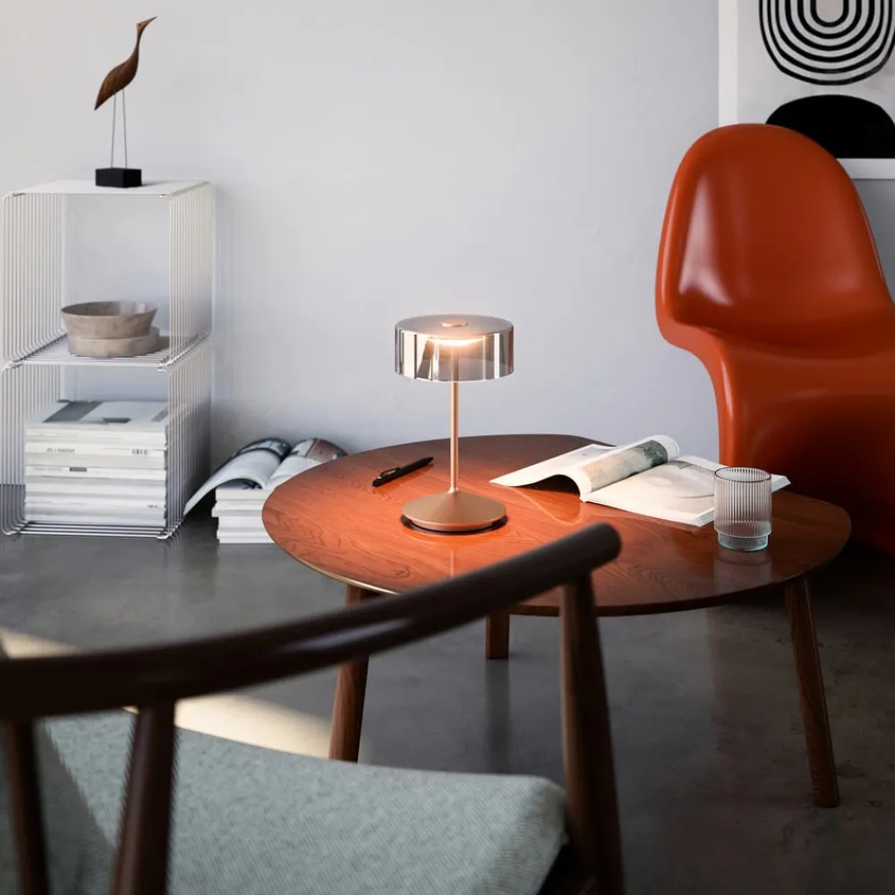 Tidløs Numotion LED-bordlampe, dimbar, med oppladbart batteri Den oppladbare Numotion LED-bordlampen er det ideelle belysningselementet for alle, med mange praktiske funksjoner og et edelt design. Denne kombinasjonen gir et bredt spekter av bruksområder på mange områder. Lampeskjermen av ekte glass av høy kvalitet og rammen av robust aluminium lover ikke bare lang levetid, men batterilampen i retro-look sørger også alltid for en hyggelig atmosfære med sitt indirekte, varme lys. På skjenken i stuen eller som leselampe på nattbordet er den alltid et blikkfang. Takket være den høye kapslingsklassen (IP54) kan den også brukes utendørs. Det stabile stativet, den lange lysvarigheten og den trådløse betjeningen gjør den fleksibel og ukomplisert, noe som gjør den ideell til bruk på bord i serveringsbransjen, men også i det private området på terrassen og balkongen. – Batteriets ladetid ca. 5-7 timer – Batterilevetid ca. 12 timer ved 100 % effekt Numotion kan dimmes trinnløst og har en funksjon som gjør det mulig å velge mellom to lysfarger. Den kan brukes i opptil 12 timer, og kan deretter enkelt lades opp igjen via magnetkontakten med nettadapter – når armaturen slås på, lyser den i varmhvitt 2 700 K – når du trykker en gang til på innkoblingsknappen, endres fargetemperaturen til 2 200 K – ved å trykke og holde inne berøringsbryteren økes eller reduseres lysintensiteten gradvis
