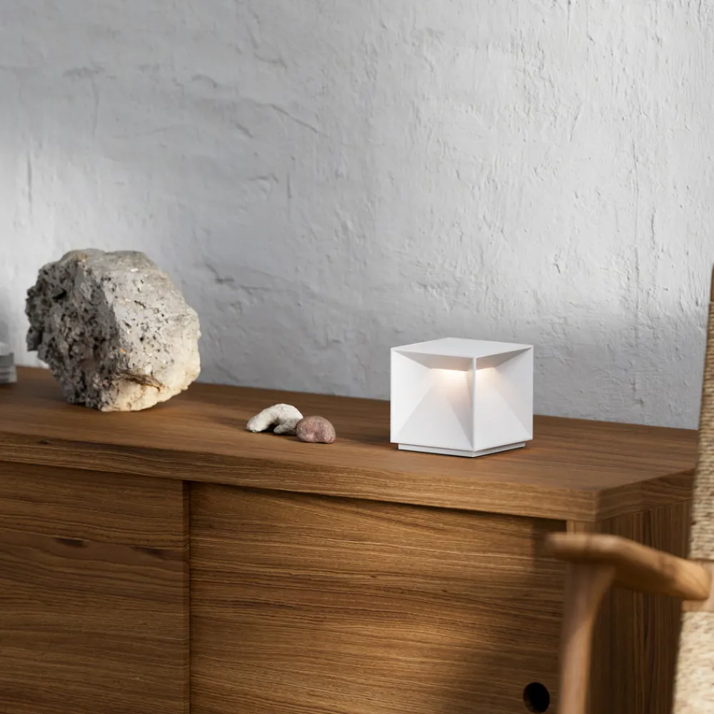 Justerbar varmhvit lysfarge: Nutalis LED-bordlampe, oppladbar, dimmer, varm CCT, Ra85, IP54 Praktisk for nattbord, skrivebord og andre steder der det er behov for et stort lysområde på liten plass: Nutalis LED-bordlampen er en kubeformet, oppladbar lampe som avgir lys over et stort område. Kubens skrå sider reflekterer lyset på en elegant måte, slik at den ser ut som et kunstobjekt når den er slått på. Takket være kapslingsgrad IP54 kan denne moderne bordlampen også brukes i beskyttede områder utendørs, for eksempel på balkonger. Det integrerte oppladbare batteriet gir behagelig belysning med varmhvitt lys i opptil 9 timer, selv uten kabel. Lysfargen kan stilles inn mellom 2 200 og 2 700 Kelvin. I tillegg kan intensiteten dimmes trinnløst ved berøring. Både en USB-kabel med magnetisk ladetilkobling og en passende nettadapter følger med i leveransen, slik at Nutalis enkelt kan lades opp. Tekniske egenskaper – med oppladbart batteri for trådløs bruk (USB-kabel og nettadapter følger med) – fargetemperatur i varmhvit kan justeres ved berøring (2.200 / 2 700 K) – trinnløst dimbar takket være integrert touch-dimmer – beskyttet mot sprutvann (IP54) – batteritid: opptil 9 timer – ladetid: 5-7 timer – oppladbart batteri: Li-Ion, 4 400 mAh – robust stativ på grunn av egenvekt (560 g)