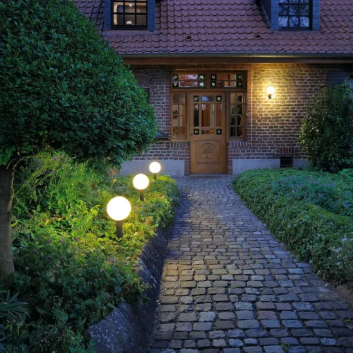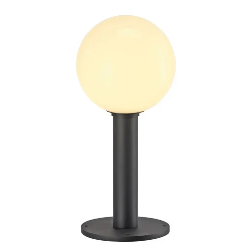 Estetisk utformet Gloo Pure-sokkelampe – høyde 44 cm Gloo Pure er en sokkelampe som ikke bare fyller praktiske funksjoner, som for eksempel å fungere som et trygt avgrensningslys, men som også er et dekorativt element på eiendommen. Den består av et aluminiumsrør med antrasittfinish og en kule av satinert glass som kan monteres med en hvilken som helst lyskilde med E27-sokkel.