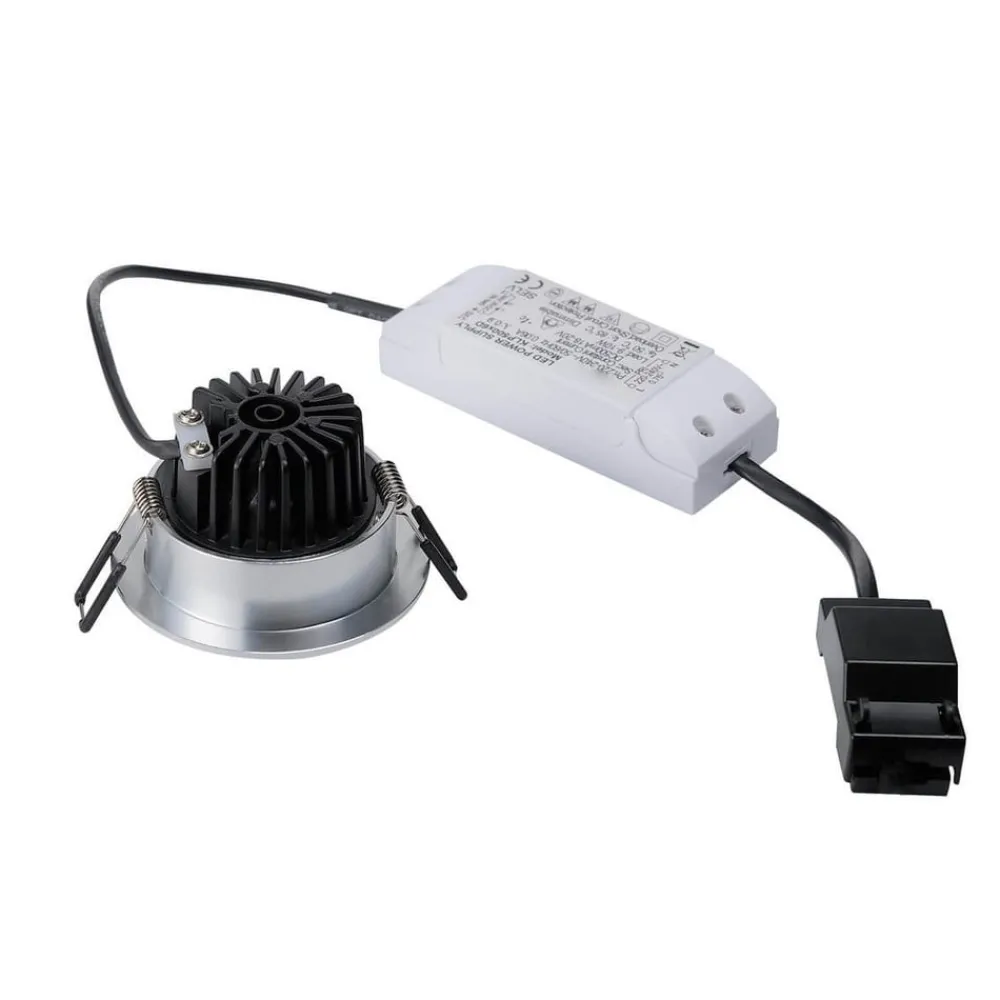 Rund LED-takinnfellingslampe Patta-I – børstet aluminium Med sin moderne design og kraftige LED-belysning (COB – chip-on-board-teknologi) passer den runde takinnfellingslampen Patta-I perfekt til mange interiørstiler. Den kan monteres i tak med en maksimal tykkelse på opptil 2,5 cm. Klemmefjærene som trengs til dette, er inkludert i leveransen. Det følger også med en dimbar LED-driver (eksternt dimbar via leading edge- eller trailing edge-fasedimmer). Med sitt varmhvite lys skaper Patta-I LED-takinnfellingslampe en stemningsfull atmosfære i rommet når den brukes enkeltvis eller i grupper – kan også brukes utendørs