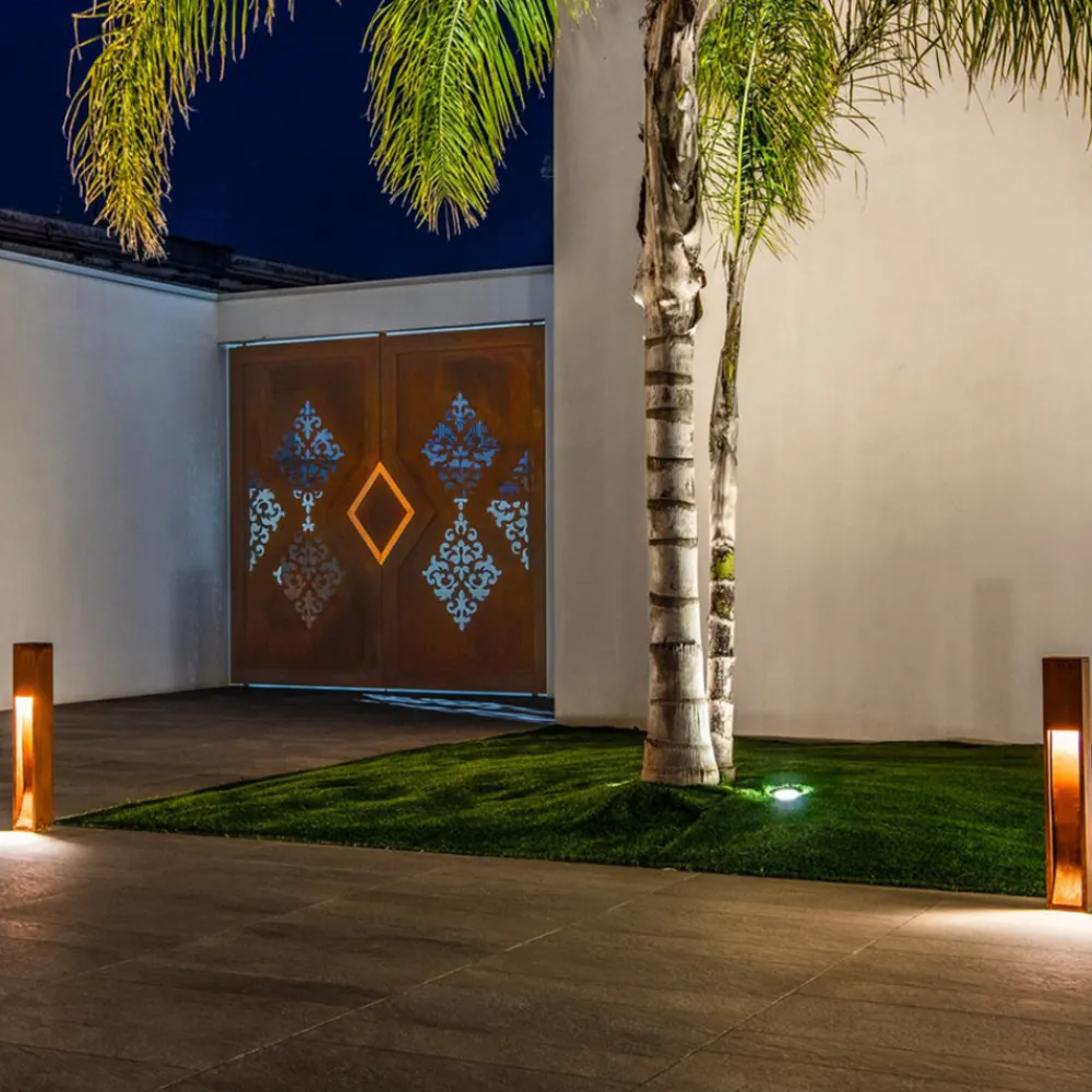 Attraktivt designet Rusty-Slot LED-gangbelysning med IP55 En utendørslampe gir ikke bare økt sikkerhet om natten ved å gi tilstrekkelig lys, men bidrar også til eiendommens design om dagen med sitt utseende. Dette er spesielt tydelig i LED-gangbelysningen Rusty-Slot i stål. Stålet som brukes til armaturen, har fått en spesiell kjemisk behandling som gir den trendy rustne looken. Visuelt skiller hver armatur seg litt fra de andre ved at lyset fra de innebygde LED-lampene sendes direkte ut og lyser opp omgivelsene på en skånsom måte.