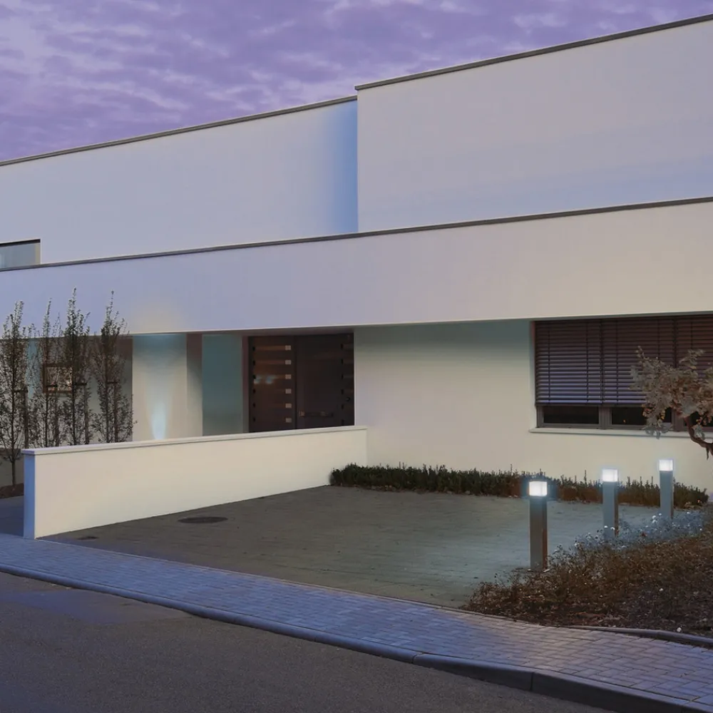 Veilampen Square Pole er laget av rustfritt stål 304 og en opal akrylkloss som inneholder pæren. Kapslingsgrad IP44 gjør den egnet for utendørs bruk. Med åpen kabelende: Det kreves en koblingsboks. Et betongankersett og en jordspyd er tilgjengelig som tilbehør.