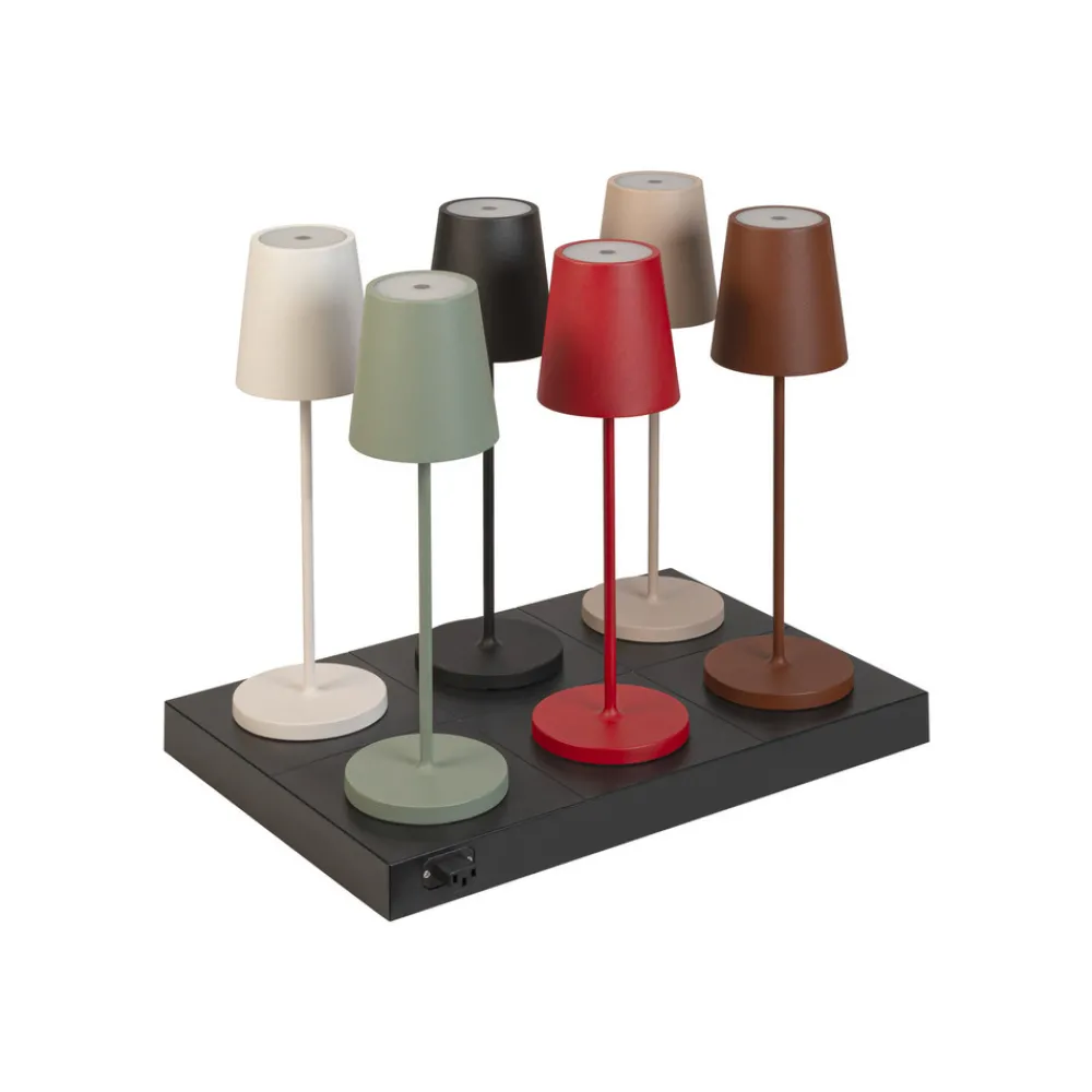 Ladesokkel til bordlampe Vinolina Two Vinolina Two er navnet på bordlampen i aluminium av høy kvalitet som også kan tas med ut takket være kapslingsgrad IP65. Den tidløse designen gjør at den kan lyse både oppover og nedover i 10 timer på én lading. Den kan lades opp med denne ladestasjonen, som kan kobles til opptil seks lamper.