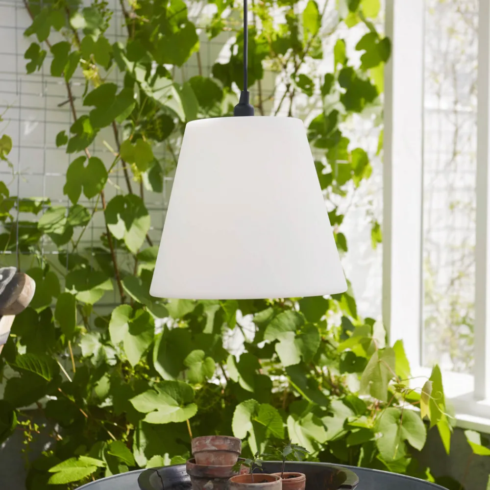 E27- fatning Ute er utstyrt med en lang kabel. En SchuKo-plugg er festet til enden av kabelen. På grunn av sin lengde er kabelen ideell til dekorative formål og som hengende lampe for utendørs bruk.